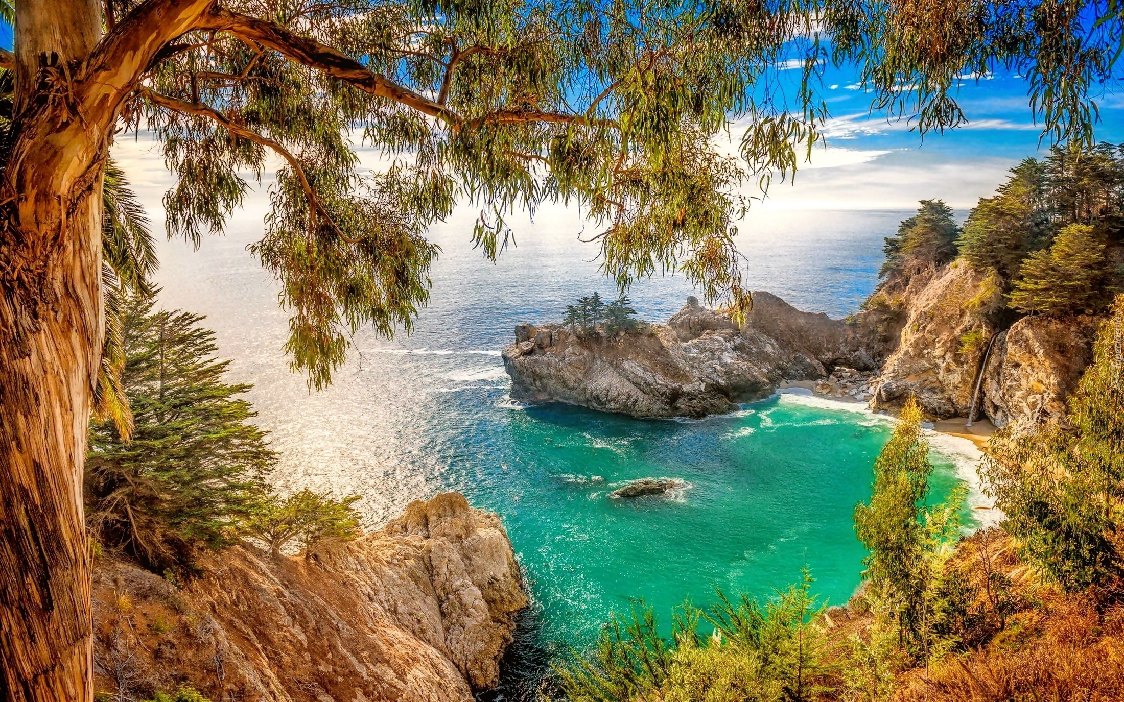 Edytor tapety: Wybrzeże, Zatoka, Skały, Drzewa, Morze