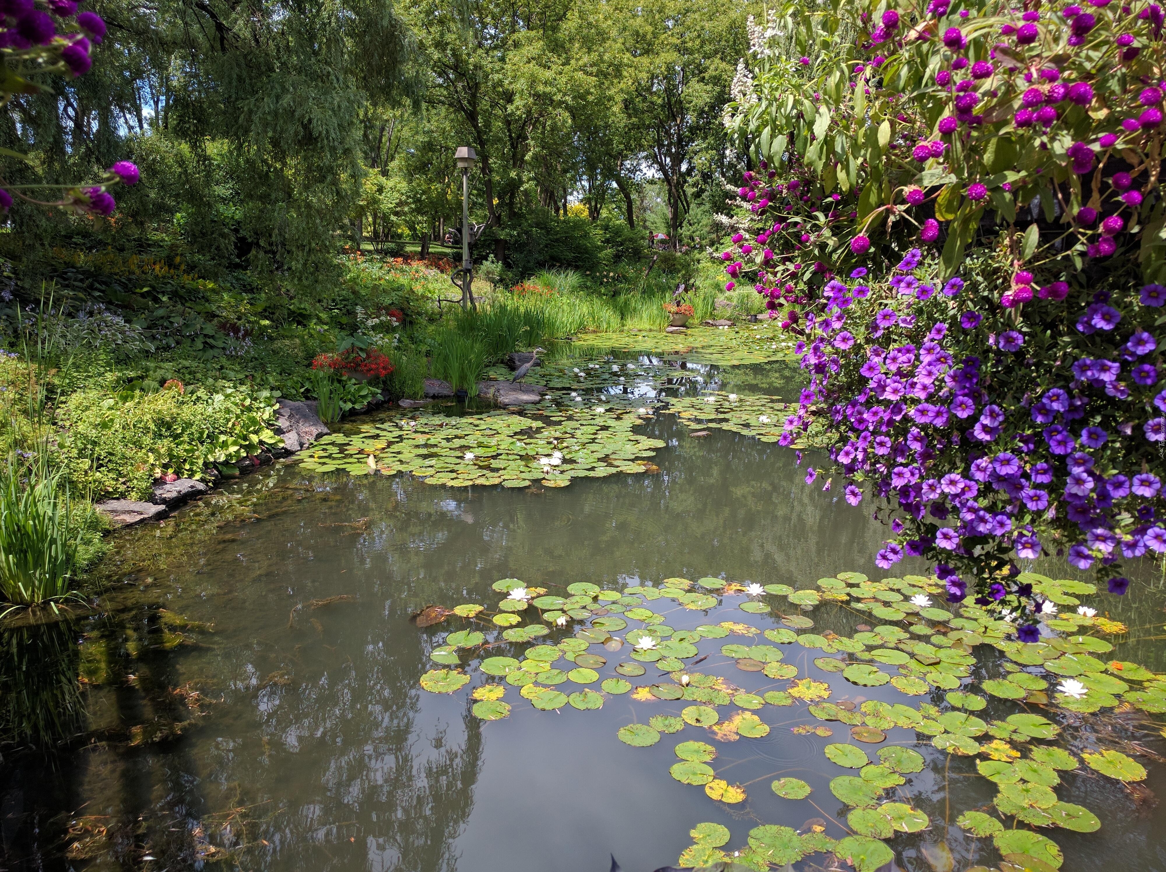 Edytor tapety: Park, Staw, Drzewa, Roślinność, Szuwary, Kwiaty