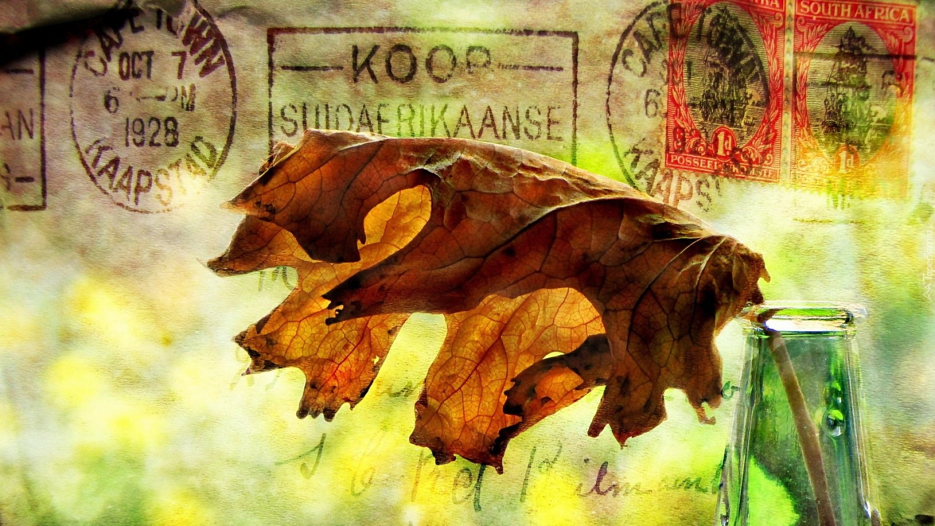 Edytor tapety: Kompozycja, Liść, Butelka, Znaczki, Stemple