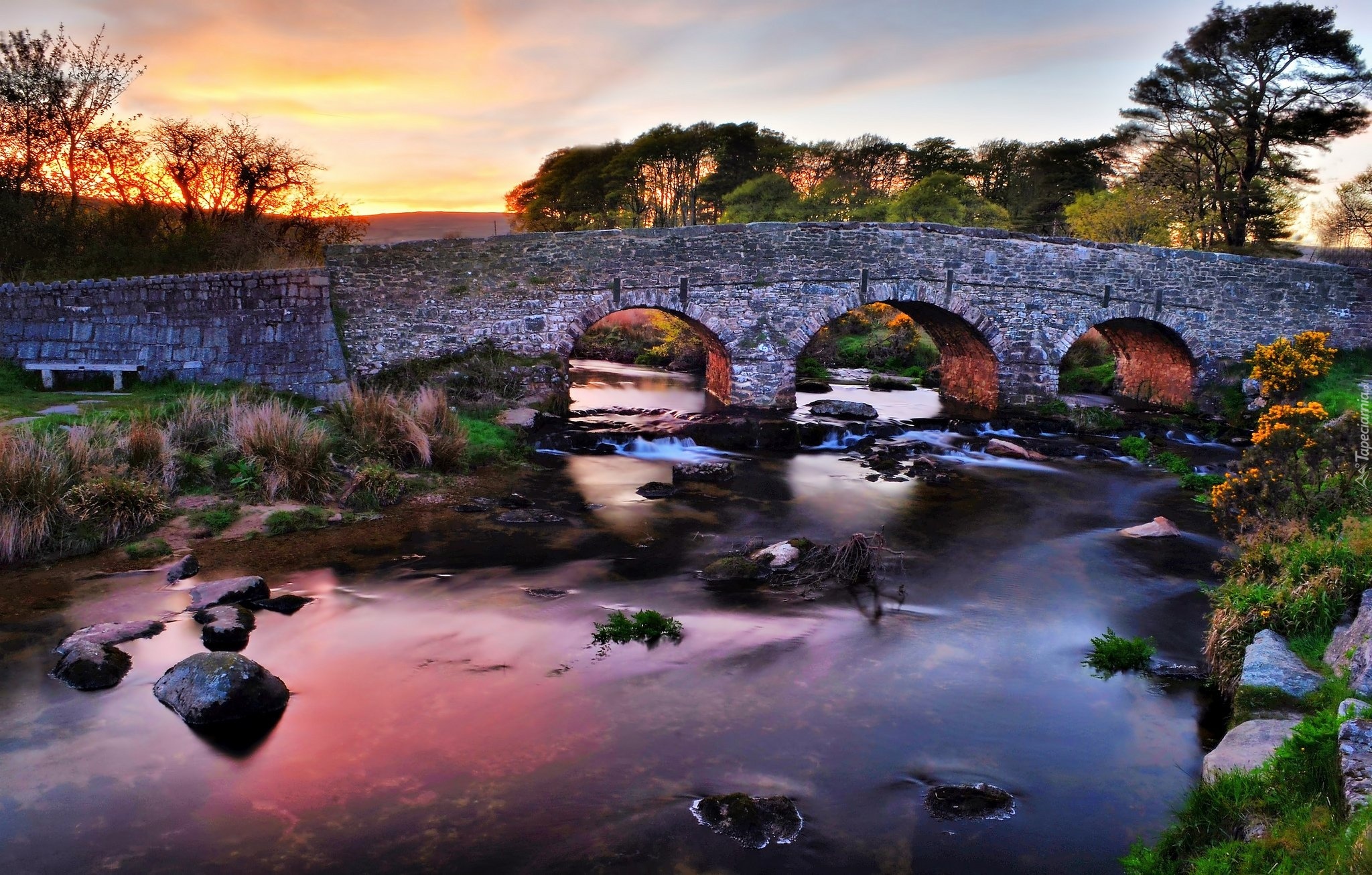 Edytor tapety: Rzeka, Zachód słońca, Most, Kamienie