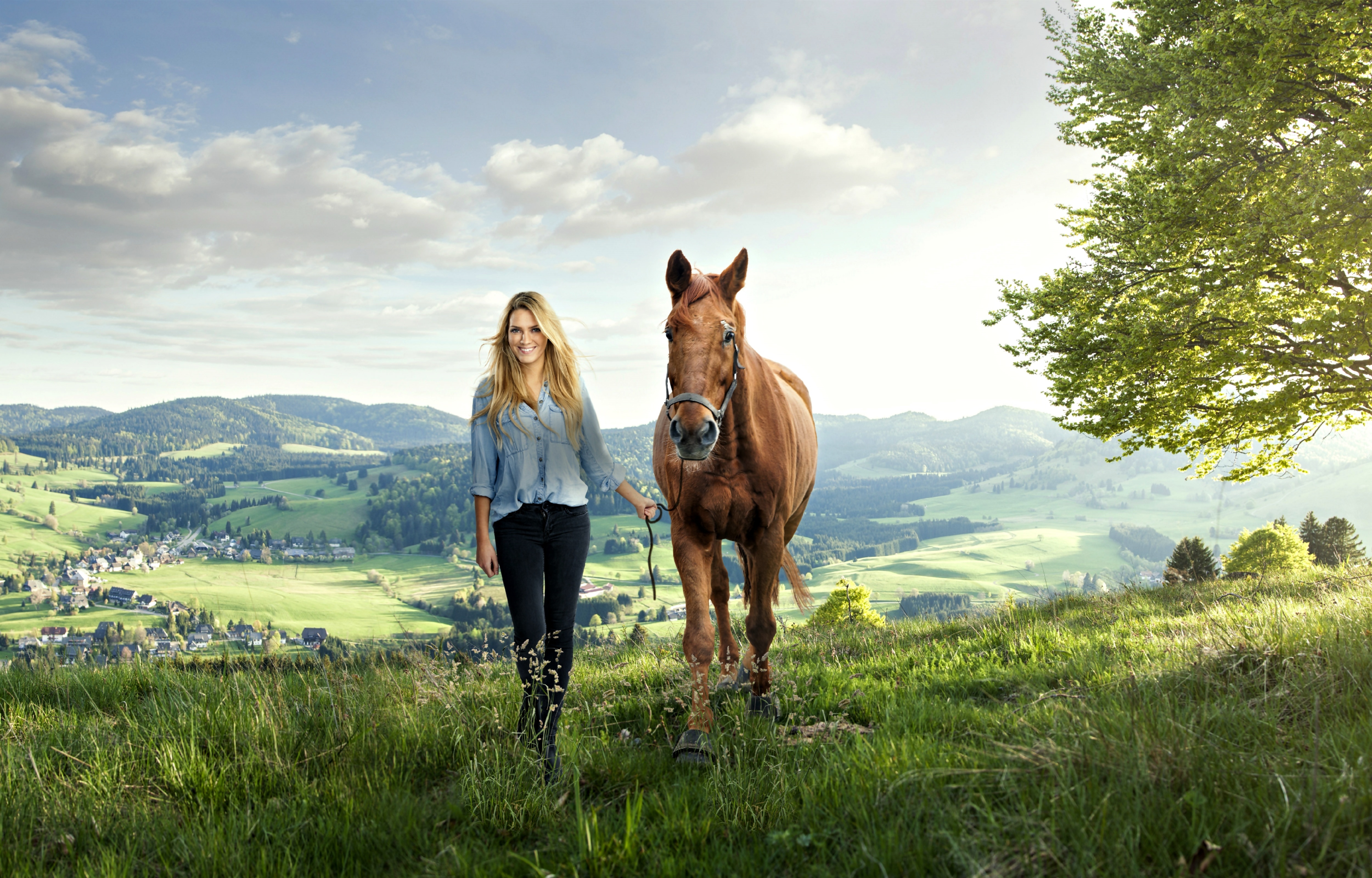 Edytor tapety: Kobieta, Koń, Łąka, Góry, Wioska
