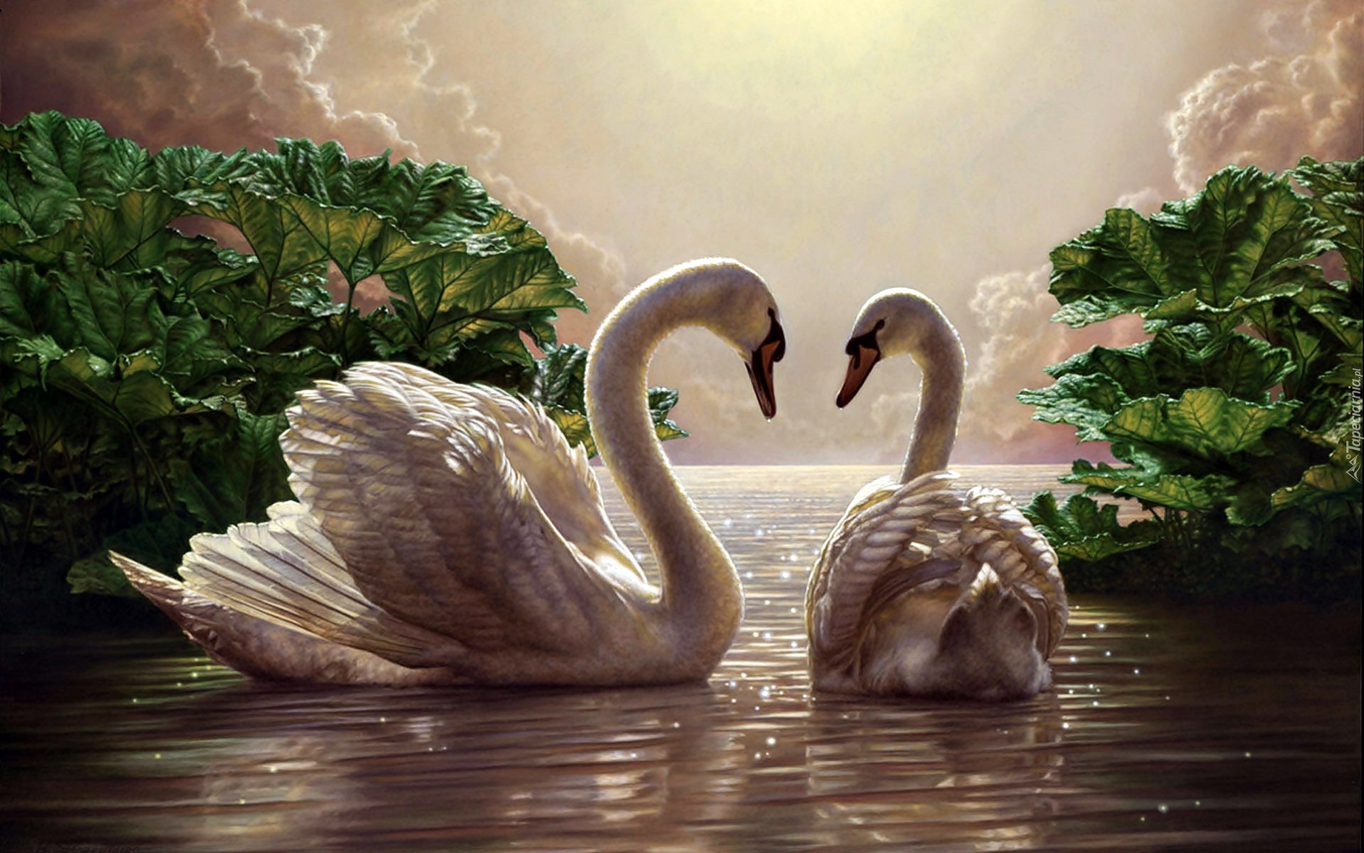 Edytor tapety: Dwa, Łabędzie, Jezioro, Zieleń, Krzewy