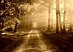 Edytor tapety: Droga, Las, Mgła, Przebijające, Światło