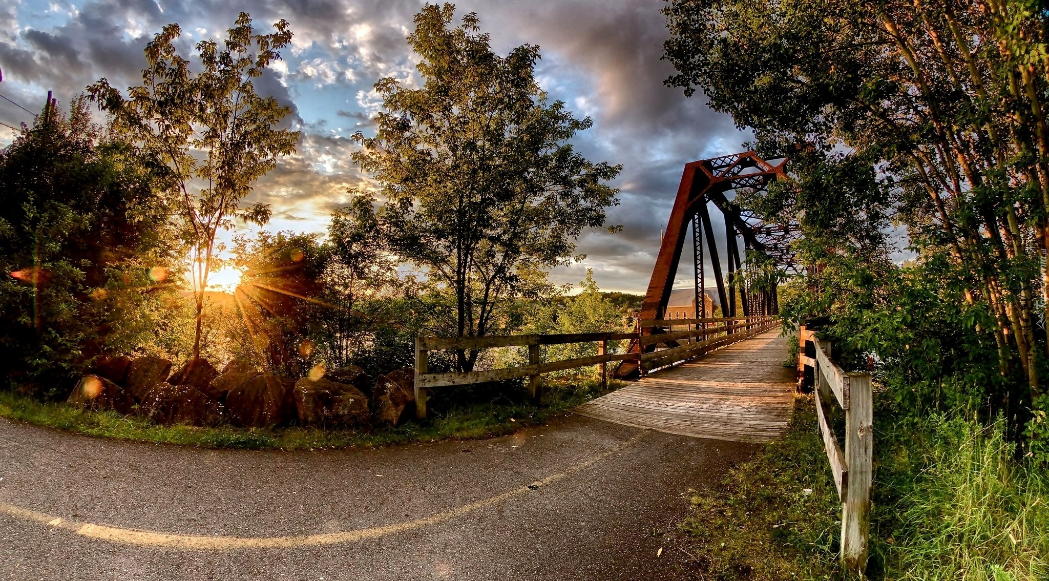 Edytor tapety: Drzewa, Most, Promienie, Słońca, Niebo