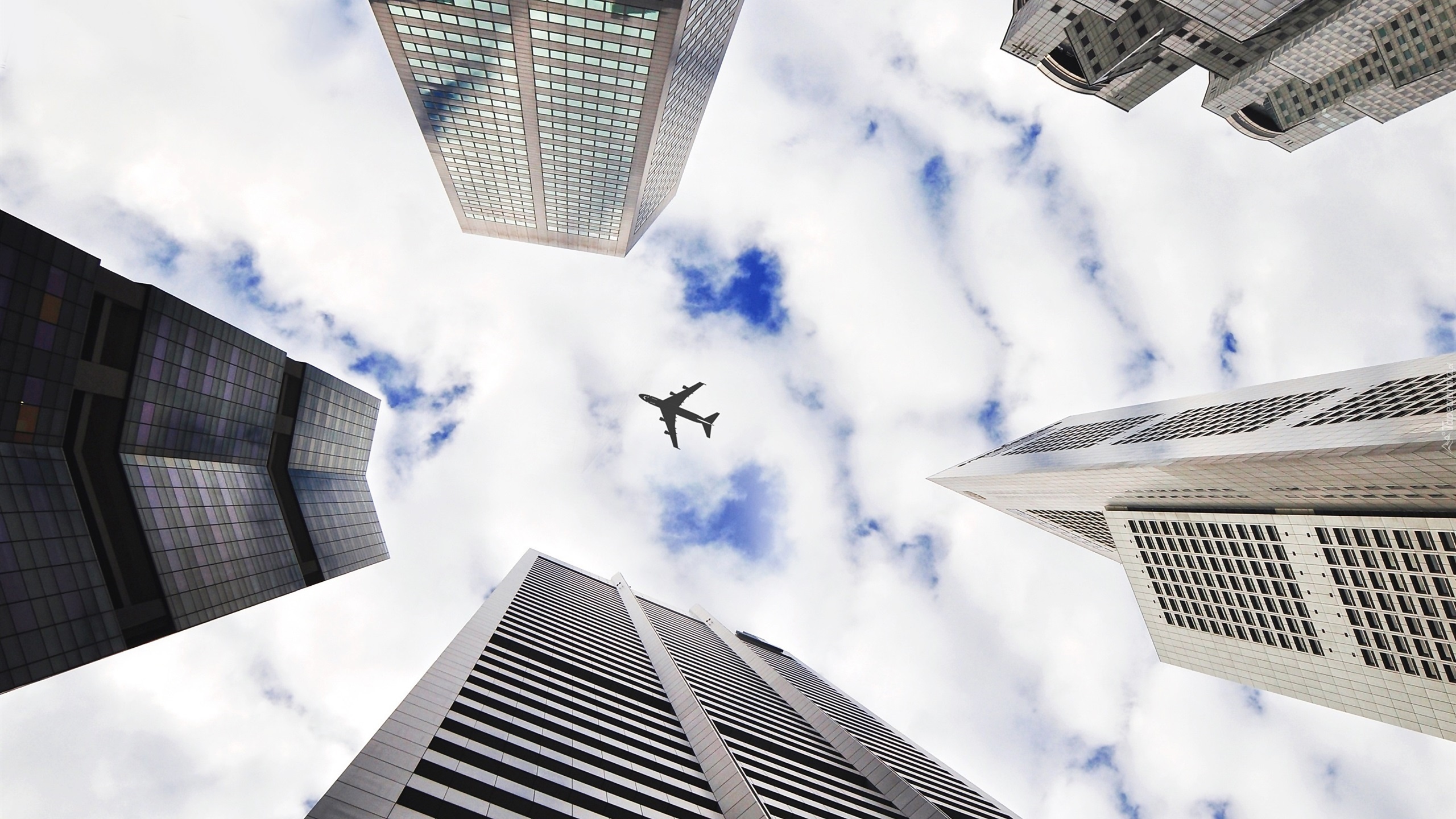 Edytor tapety: Samolot, Niebo, Chmury, Domy, Drapacze, Chmur