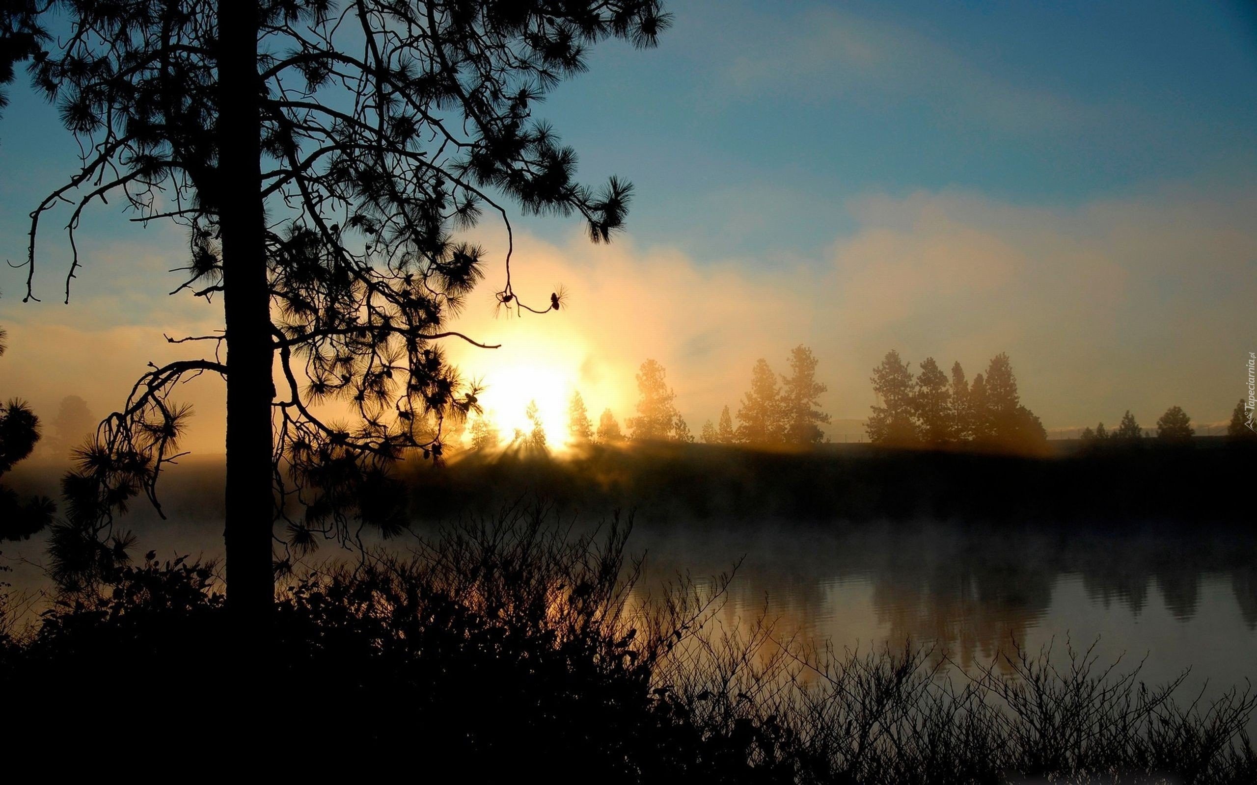 Edytor tapety: Rzeka, Wschód słońca, Sosna