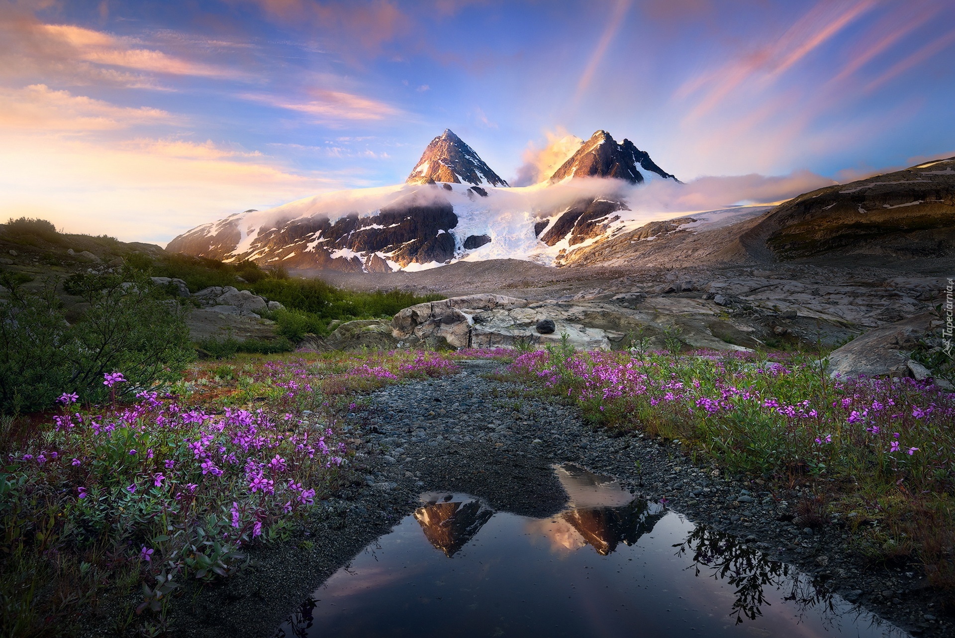 Edytor tapety: Góry, Śnieg, Chmury, Roślinność, Kwiaty, Woda