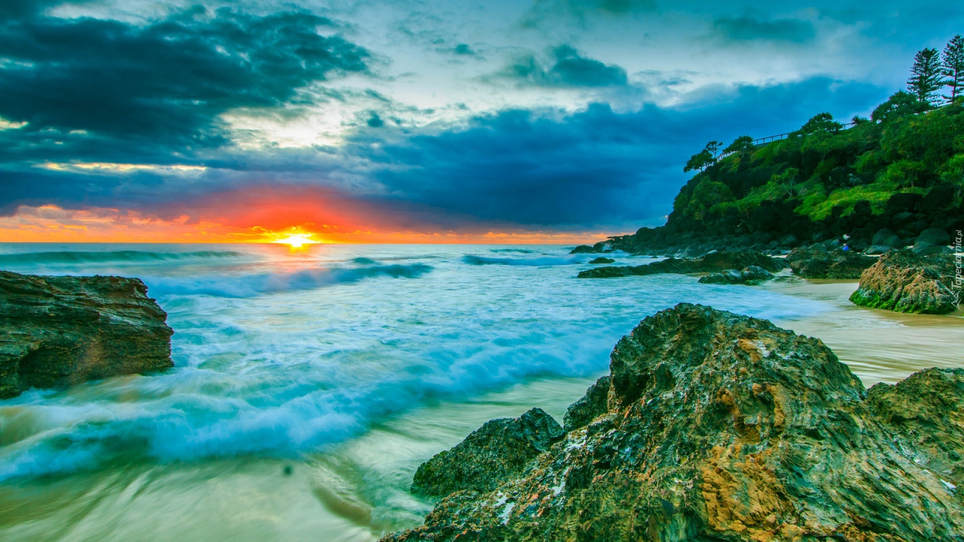 Edytor tapety: Zachód, Słońca, Skały, Ocean