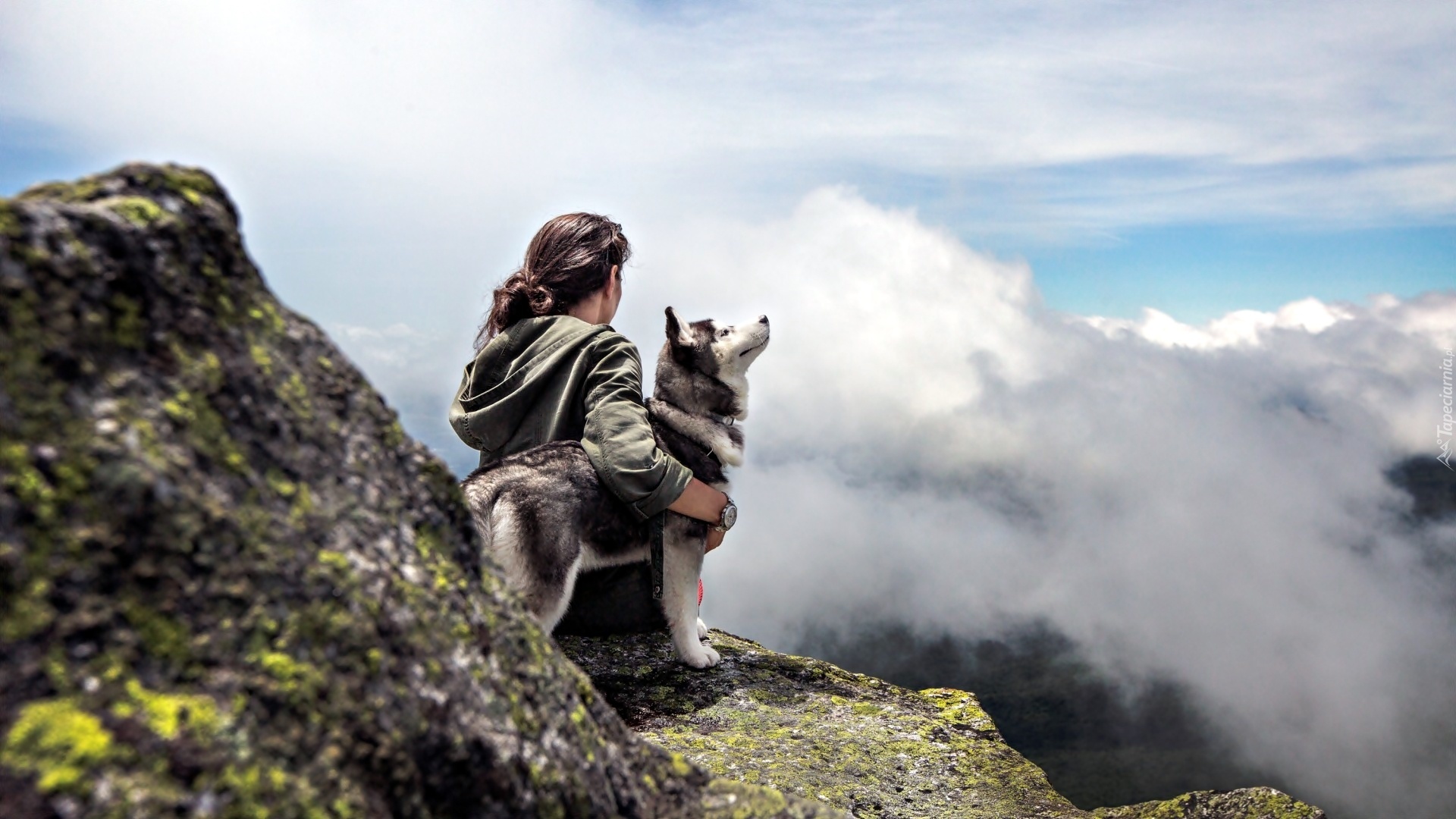Edytor tapety: Dziewczyna, Pies, Góry, Szczyt, Mgła