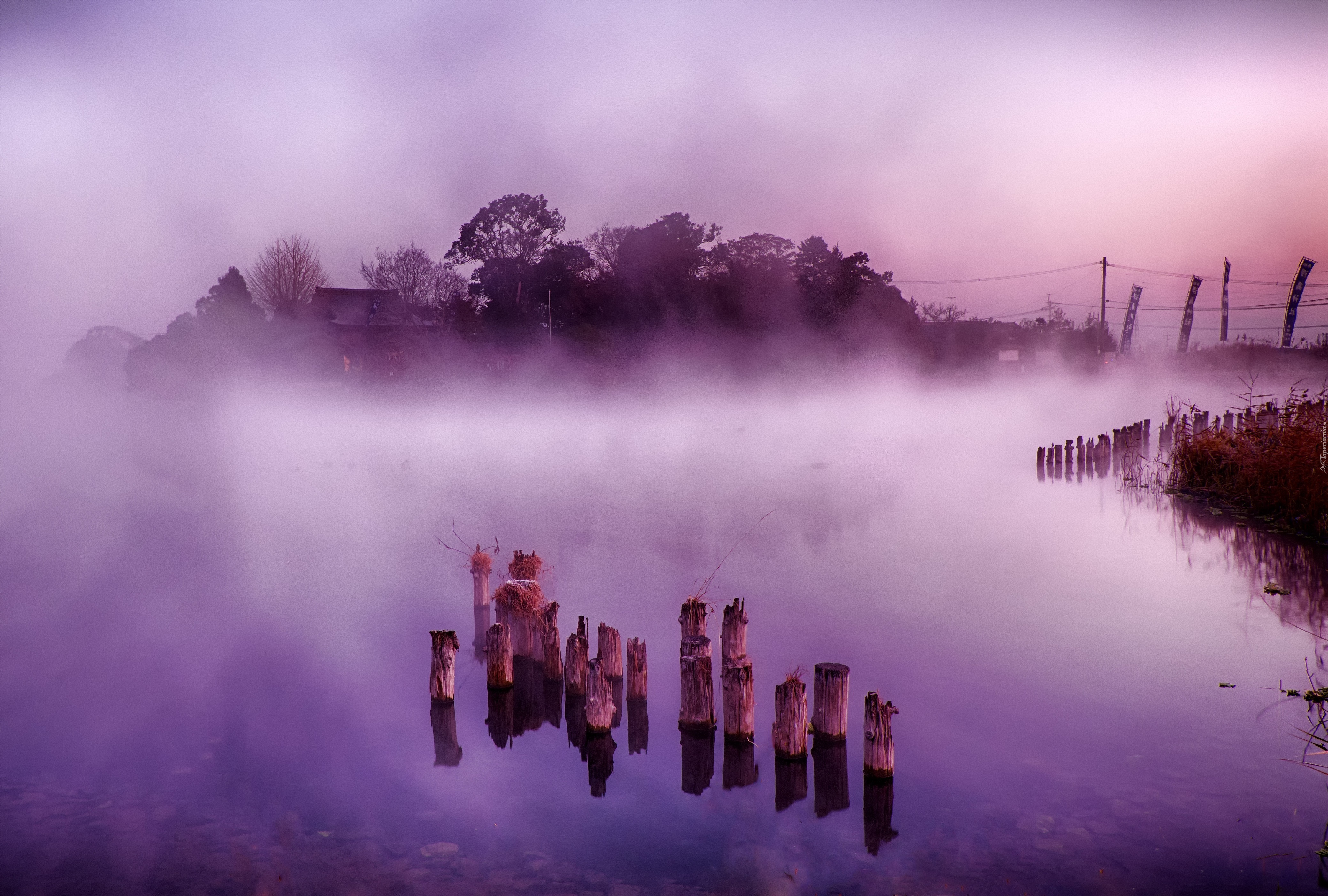 Edytor tapety: Japonia, Pływająca, Wyspa, Mgła, Jezioro, Świt