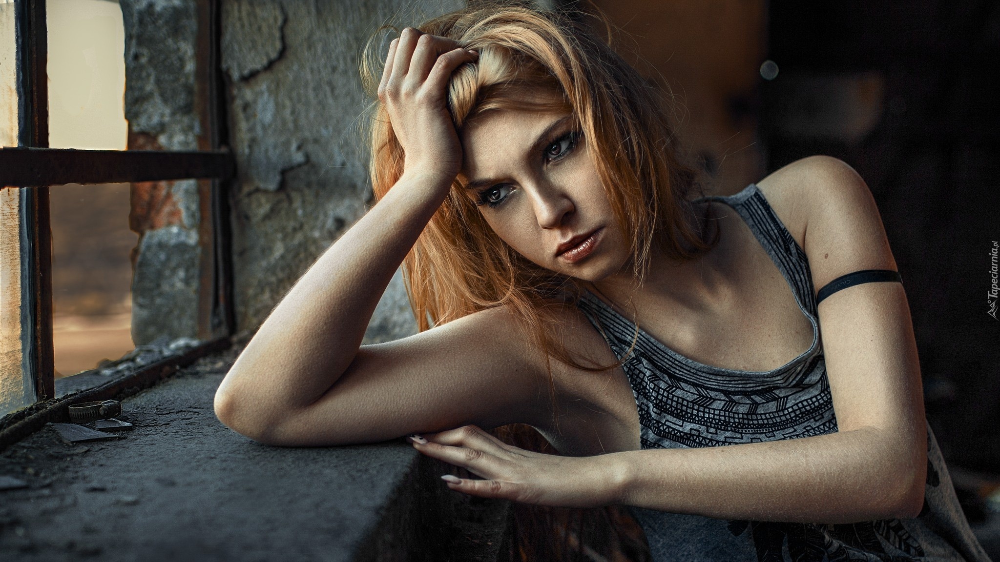 Edytor tapety: Kobieta, Zamyślona, Okno, Parapet