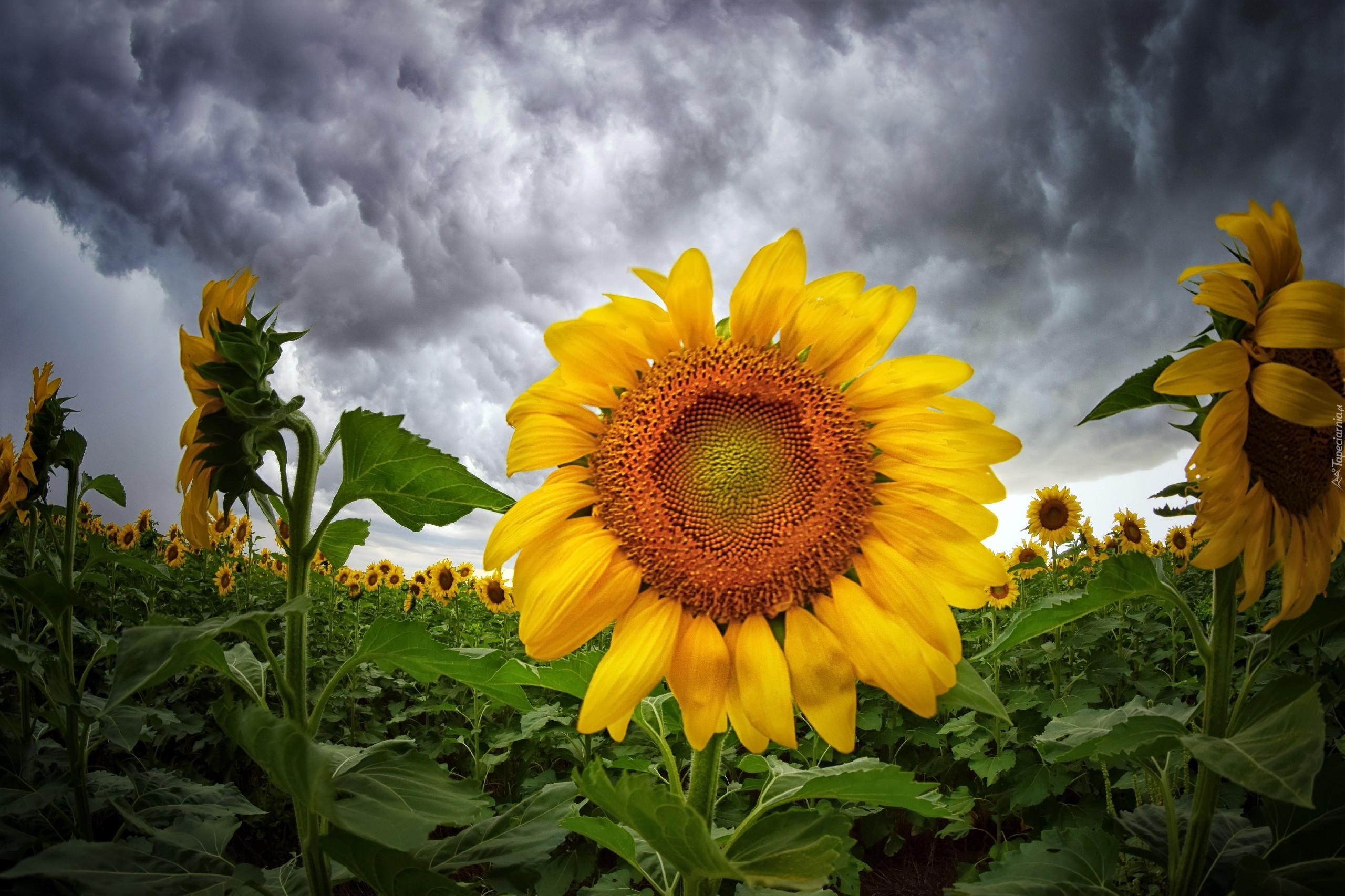 Edytor tapety: Plantacja, Słoneczników, Ciemne, Chmury
