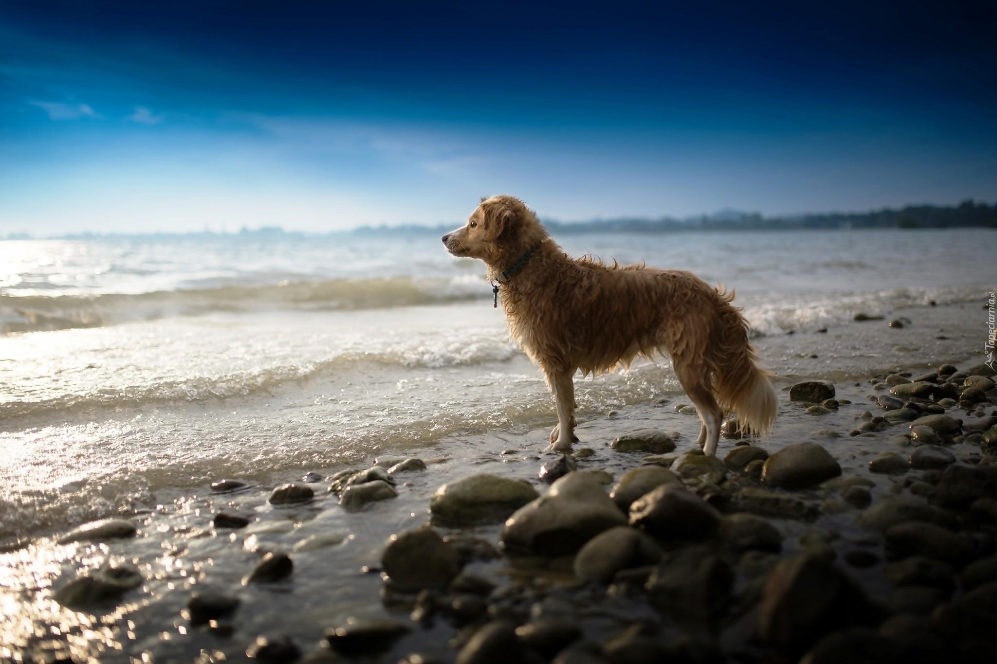 Edytor tapety: Morze, Kamienie, Fale, Pies, Świt, Oczekiwanie