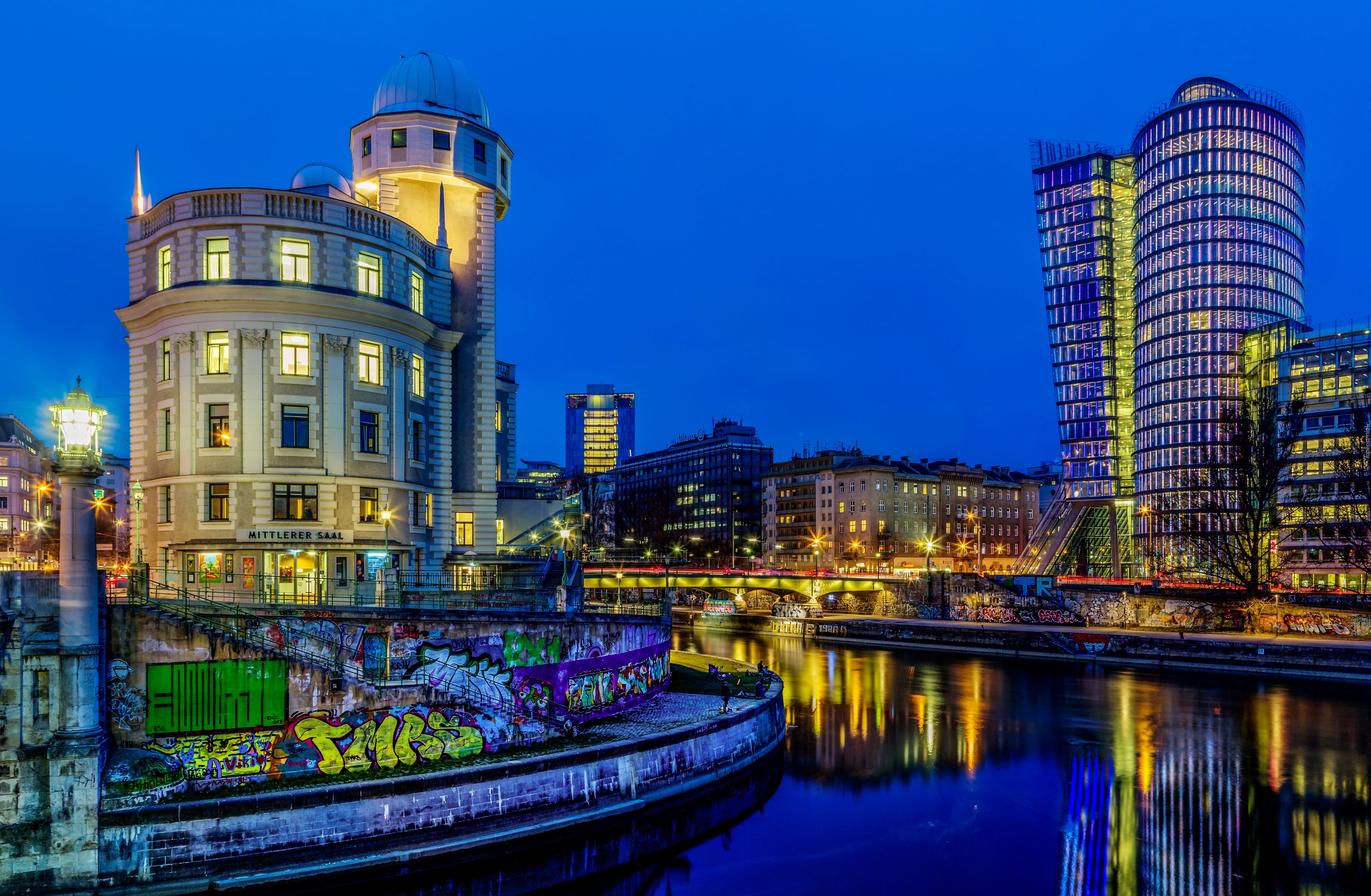 Edytor tapety: Rzeka, Kanał, Wieżowce, Domy, Wiedeń, Nocą, Austria