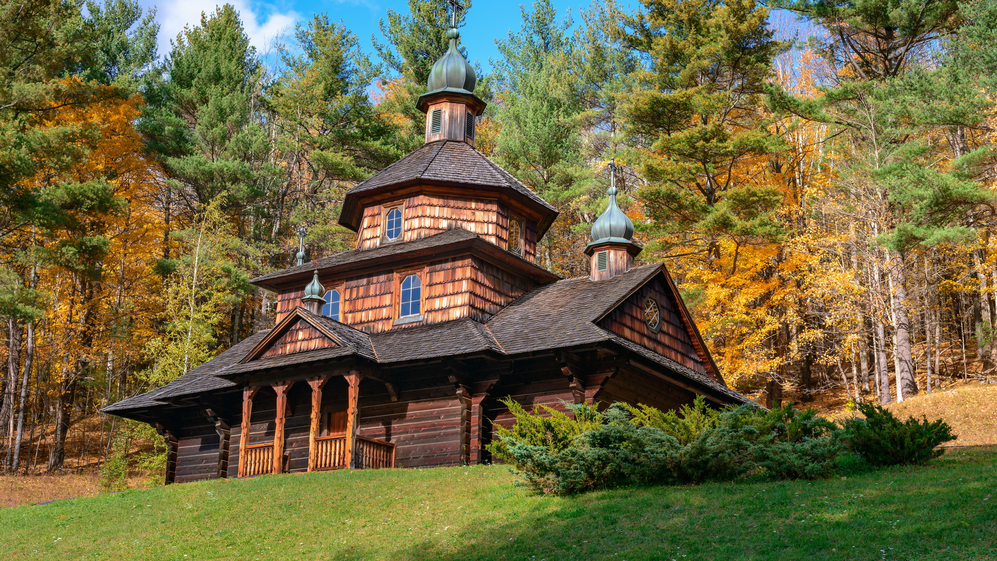Edytor tapety: Katolicki ukraiński kościół św Jana Chrzciciela, Jewett, Catskill, Stan Nowy Jork, Stany Zjednoczone, Drewniany, Kościółek, Las, Jesień, Drzewa