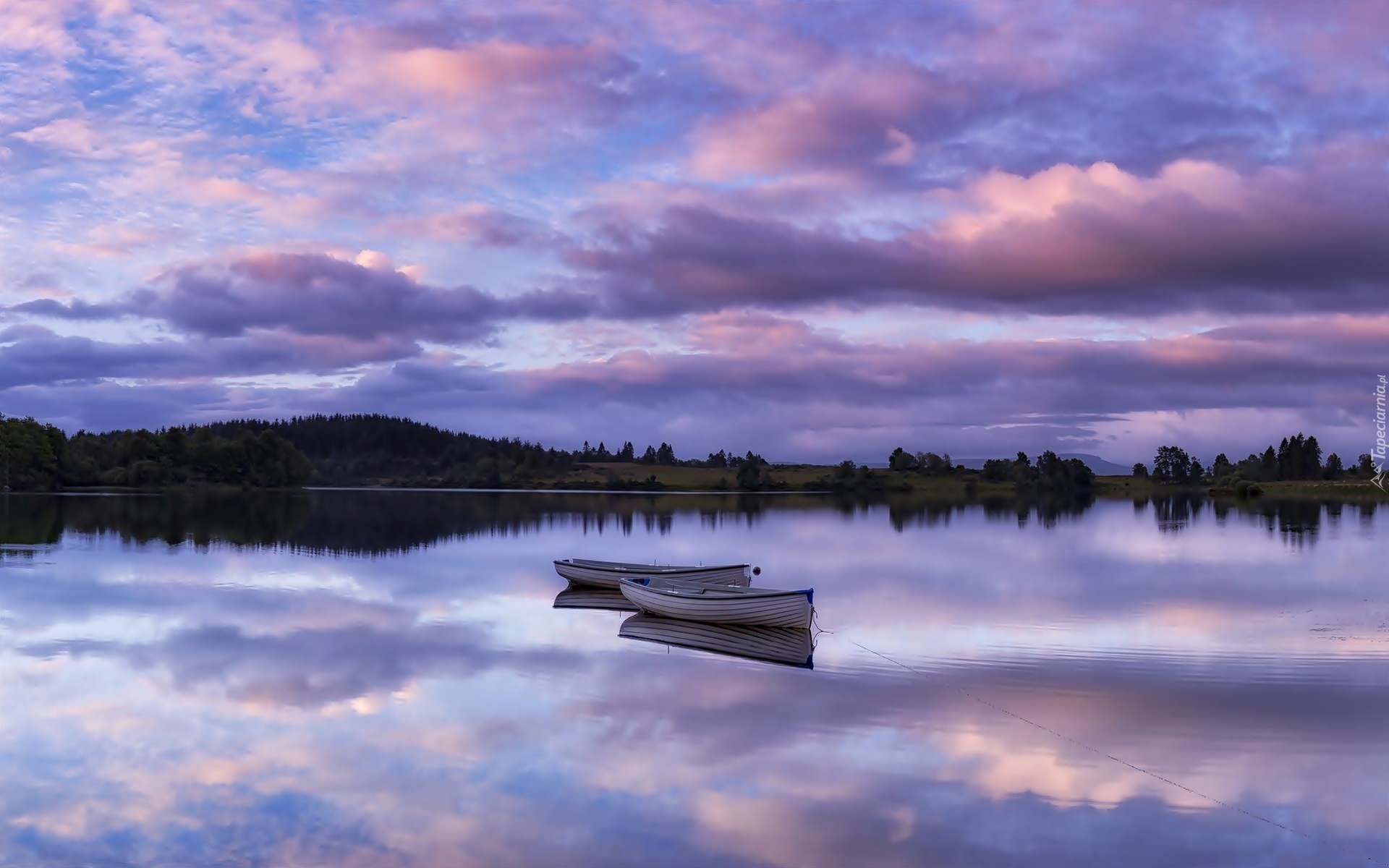 Edytor tapety: Jezioro, Łódki, Wzgórza, Chmury, Zmierzch