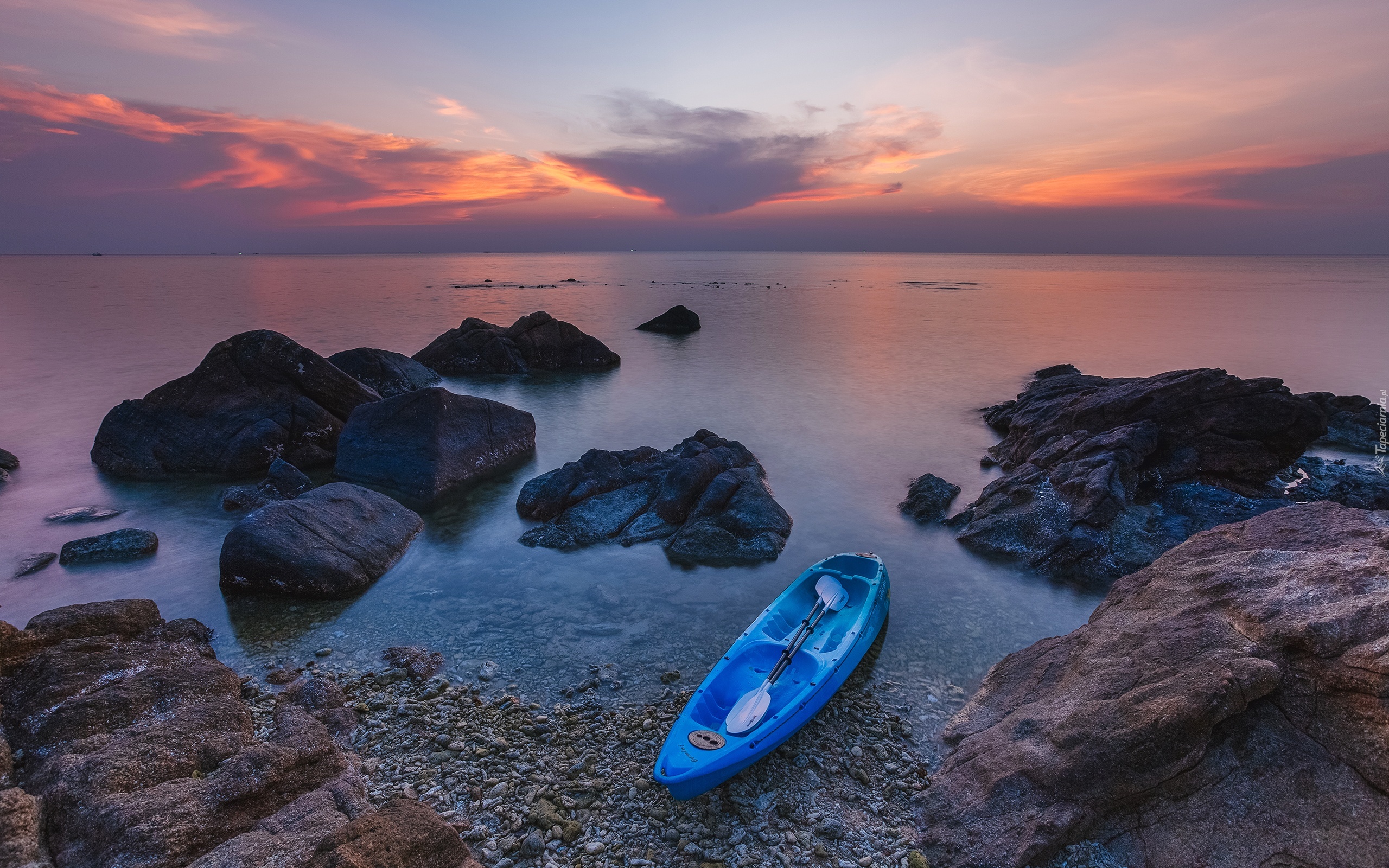Edytor tapety: Morze, Skały, Kamienie, Zachód słońca, Kajak