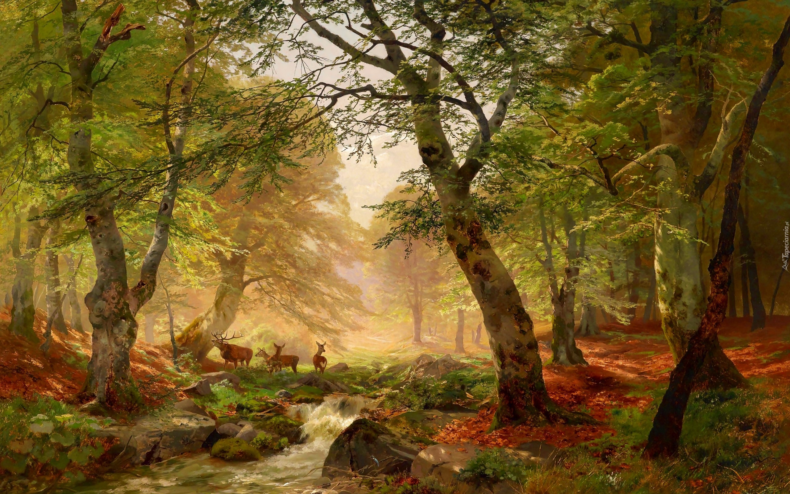 Edytor tapety: Malarstwo, Obraz, Las, Drzewa, Strumień, Jeleń, Sarny