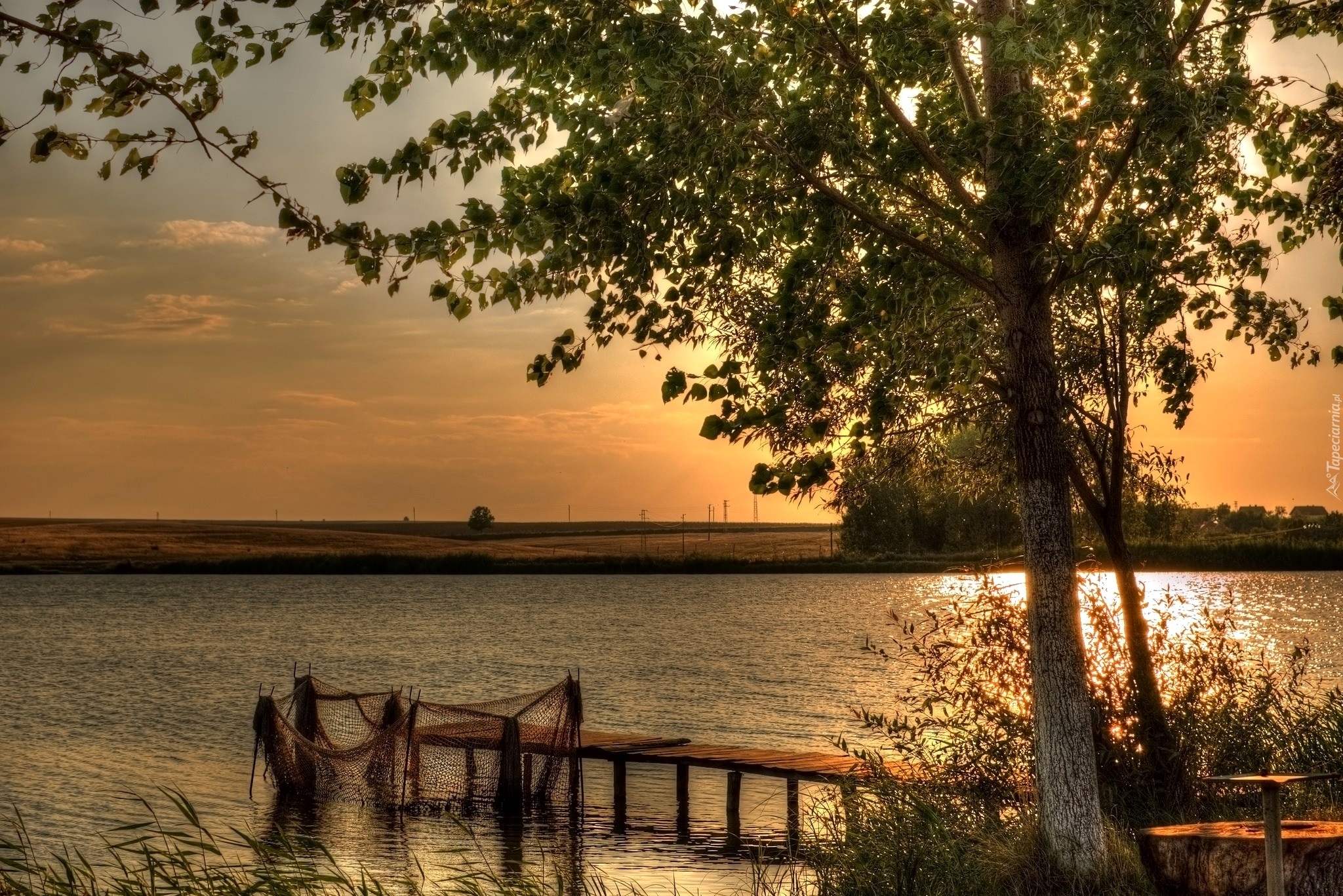 Edytor tapety: Jezioro, Drzewo, Pomost, Wschód, Słońca