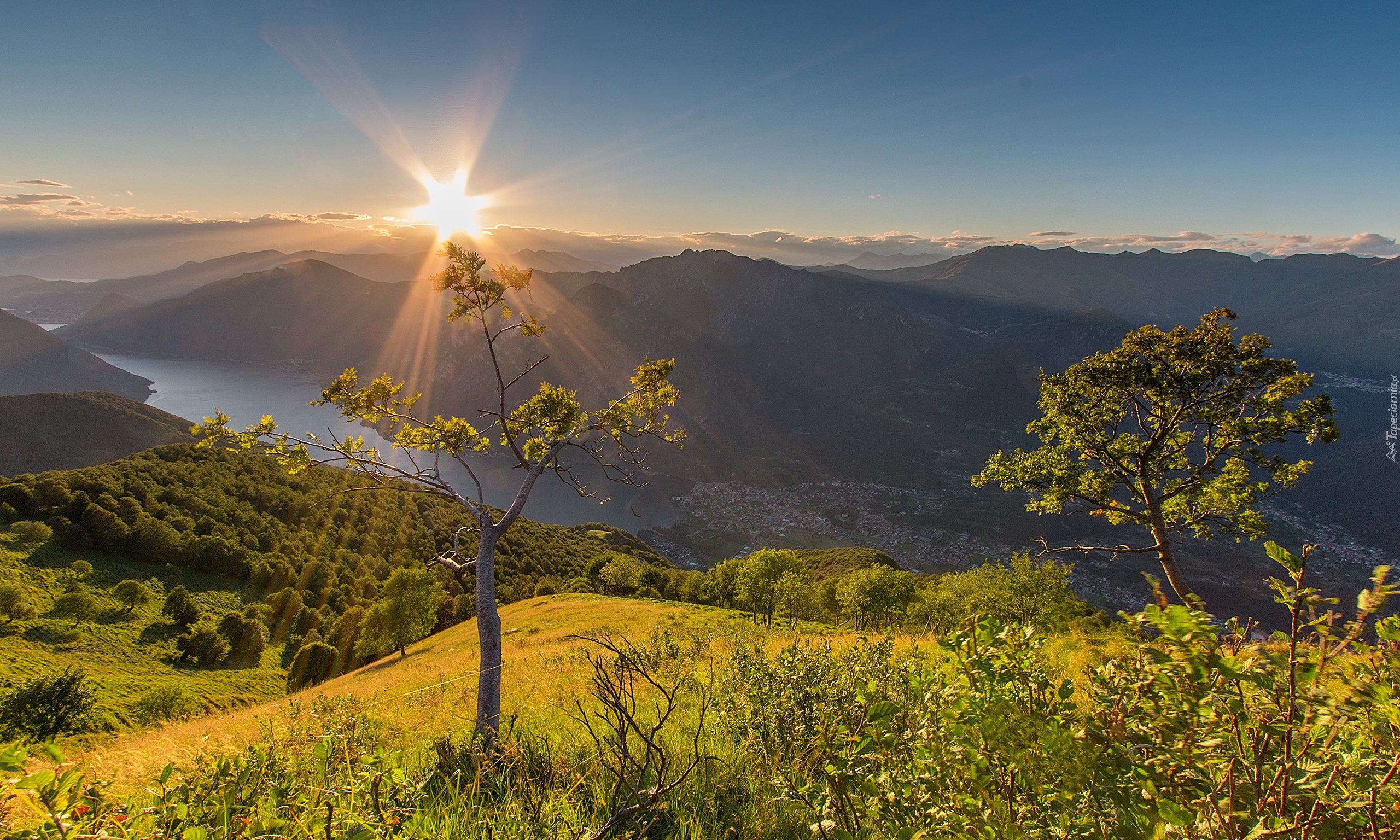 Edytor tapety: Góry, Jezioro, Promienie słońca, Drzewa