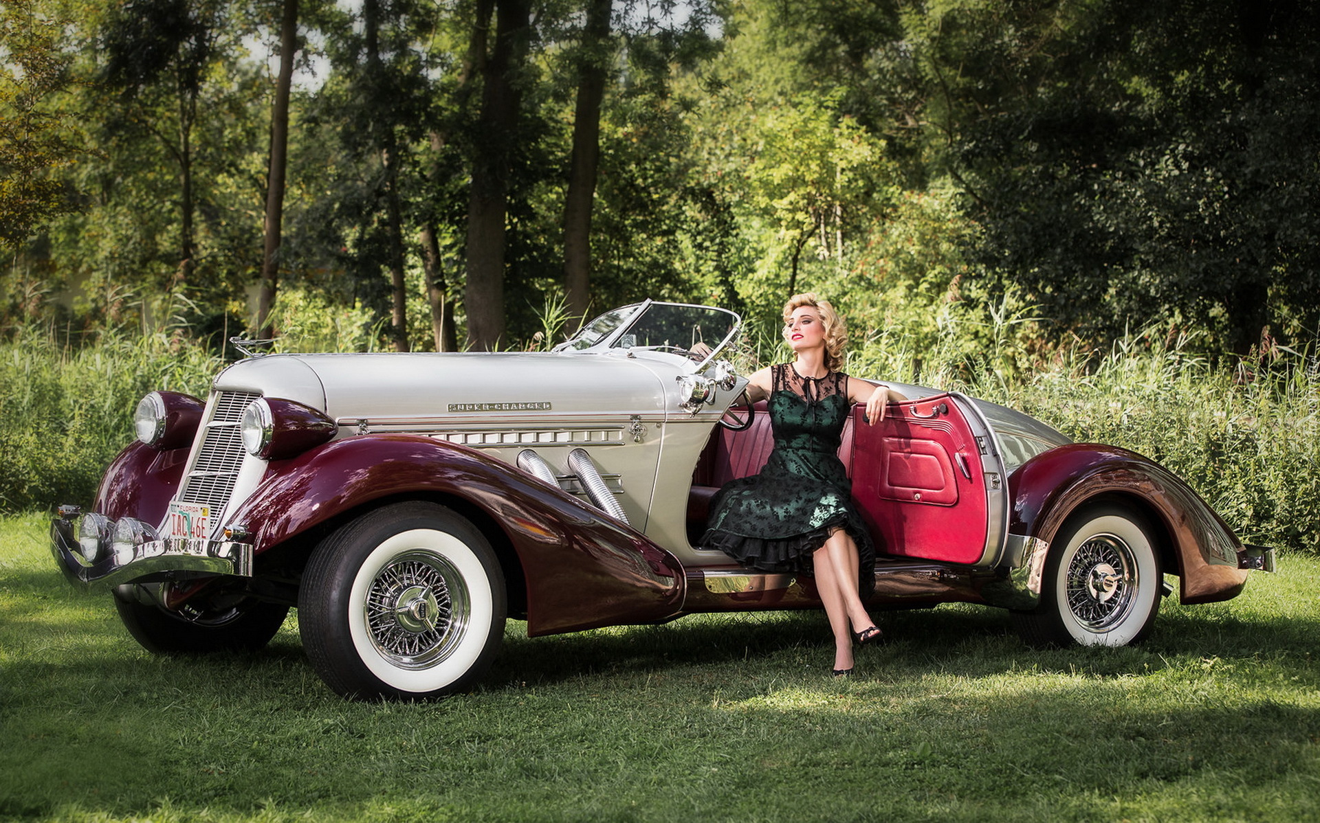 Edytor tapety: Samochód, Kobieta, Las, Polana, Drzewa