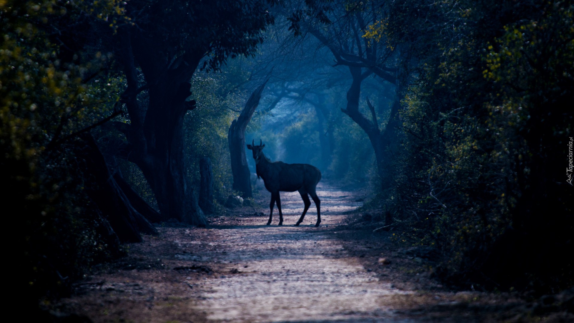 Edytor tapety: Las, Mgła, Droga, Jeleń, Drzewa