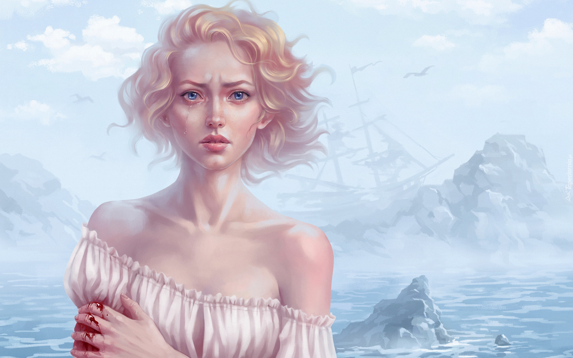 Edytor tapety: Grafika, Kobieta, Łzy, Morze, Statek, Skały
