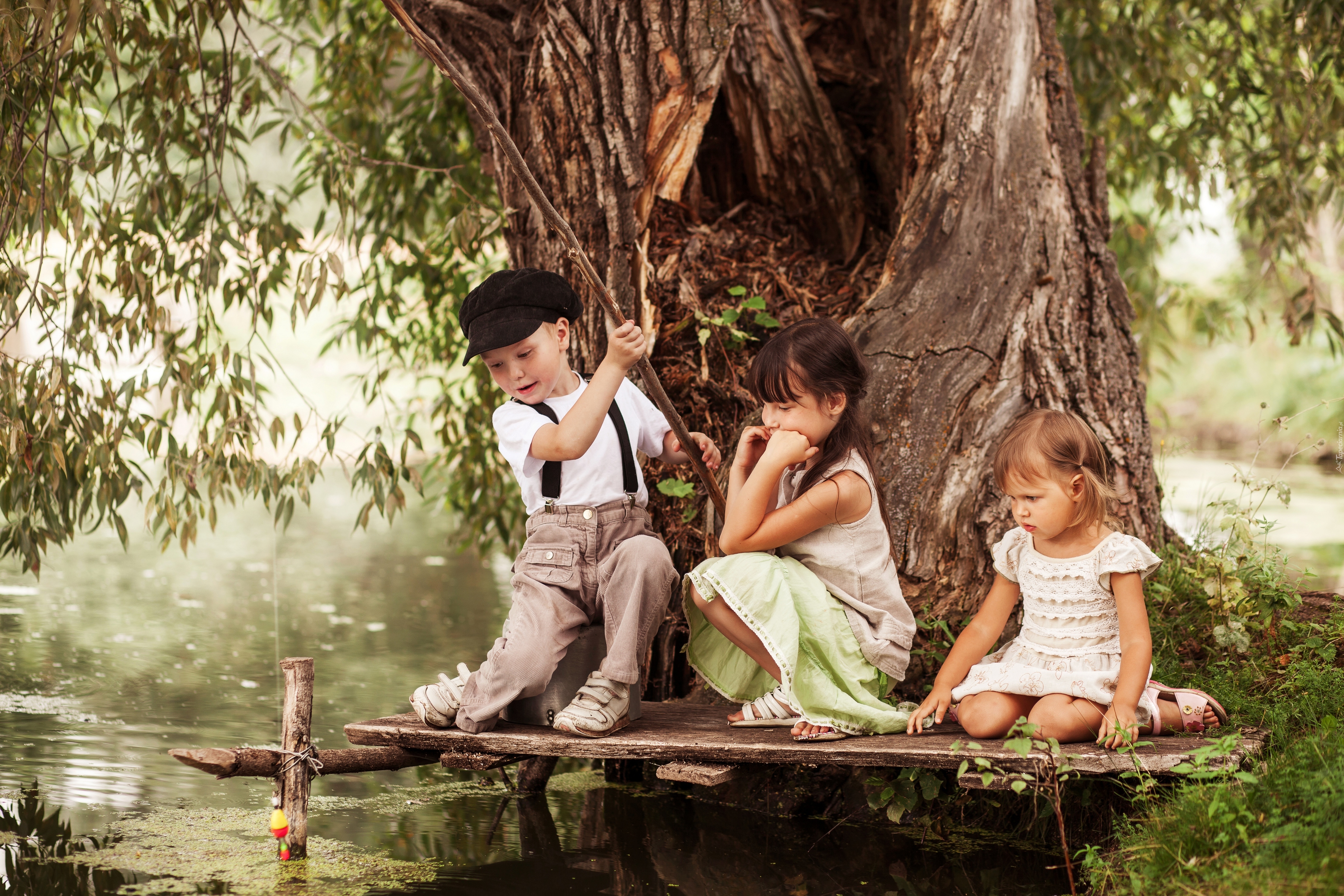 Edytor tapety: Dzieci, Kładka, Rzeka, Drzewo, Wędkowanie