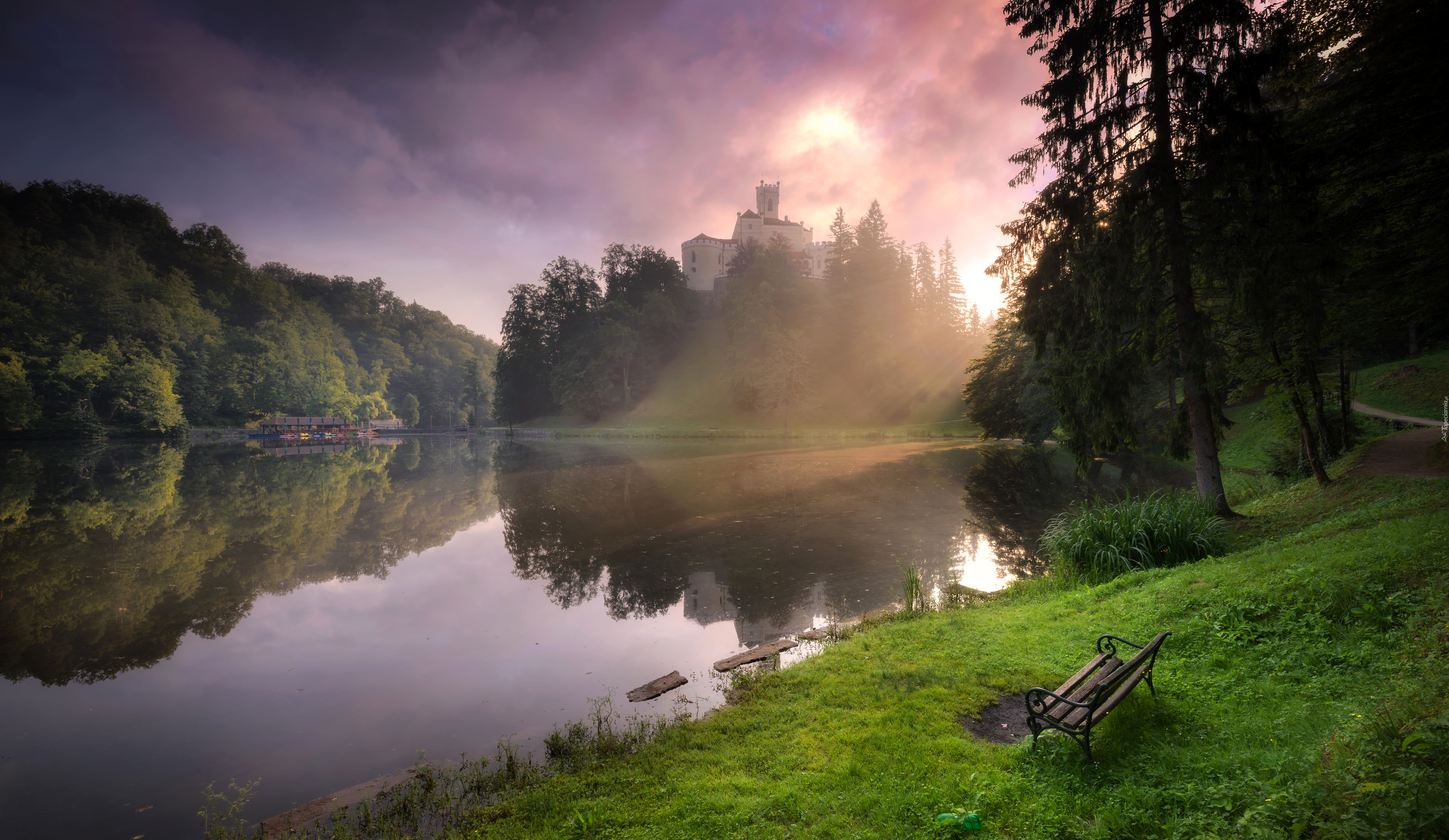 Edytor tapety: Jezioro, Chorwacja, Ławka, Drzewa, Przebijające światło