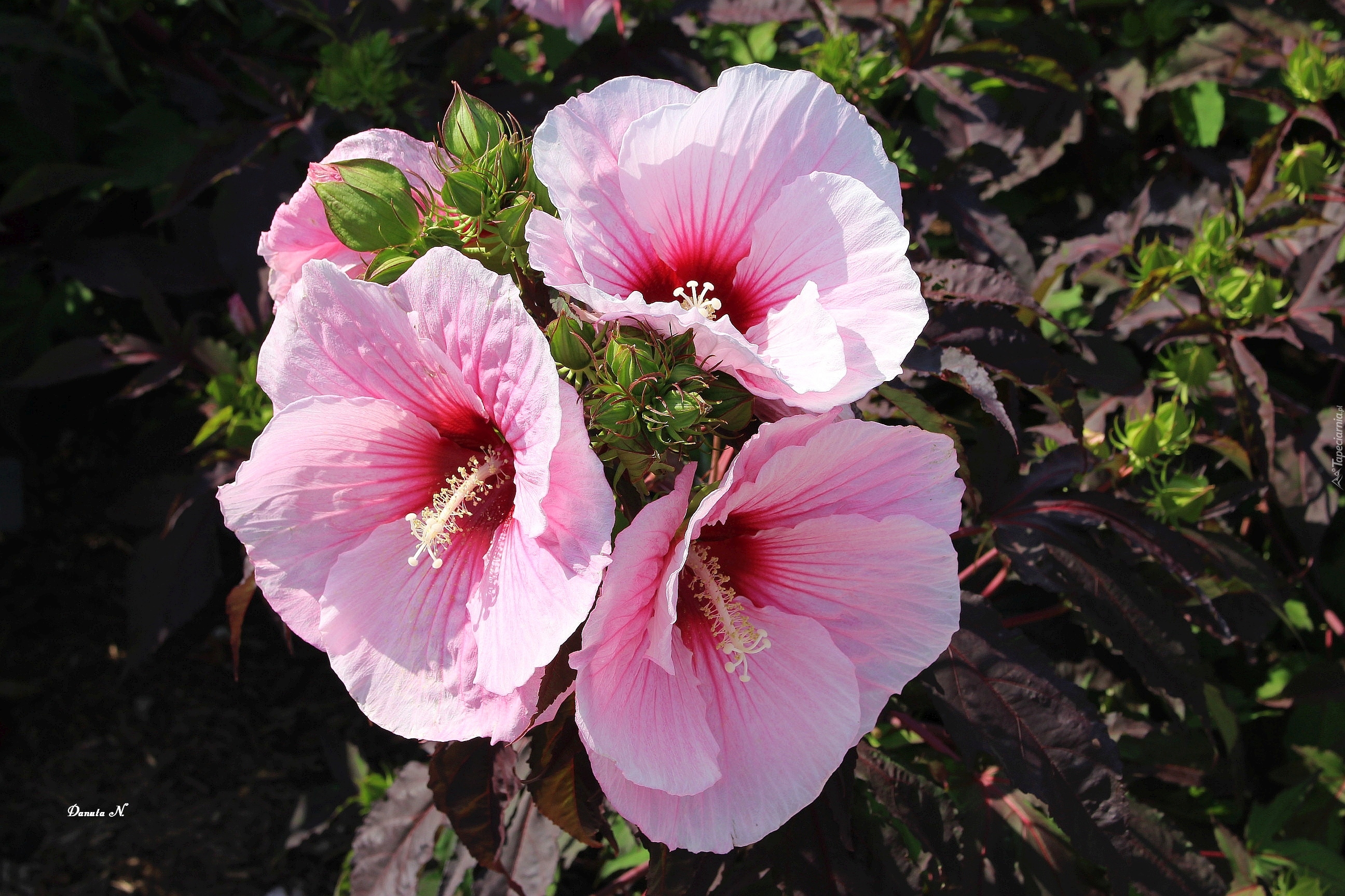 Edytor tapety: Kwiaty, Hibiskus, Trzy, Różowe, Liście, Pąki, Ogród, Lato