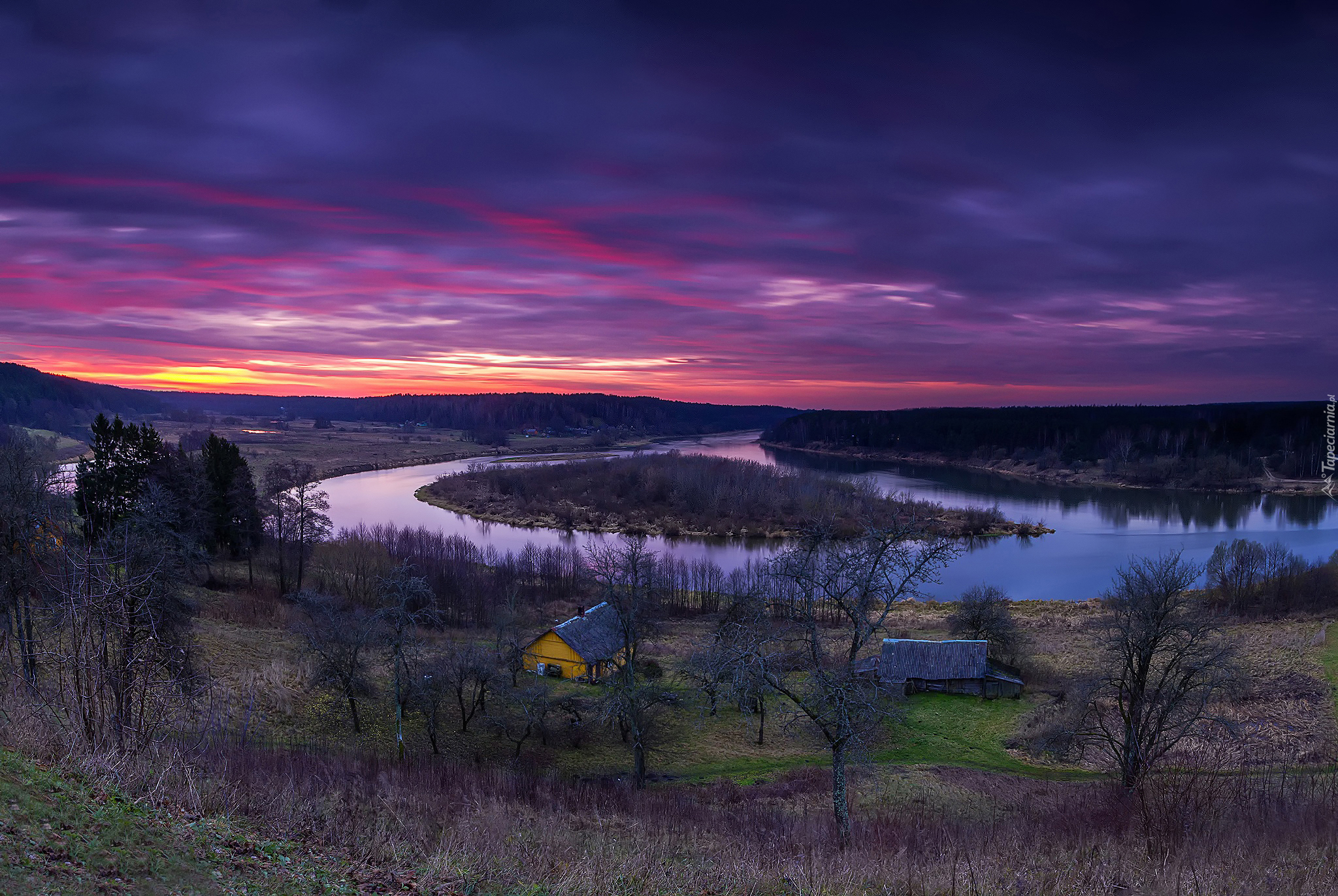 Edytor tapety: Litwa, Rzeka, Zachód, Słońca, Chatki