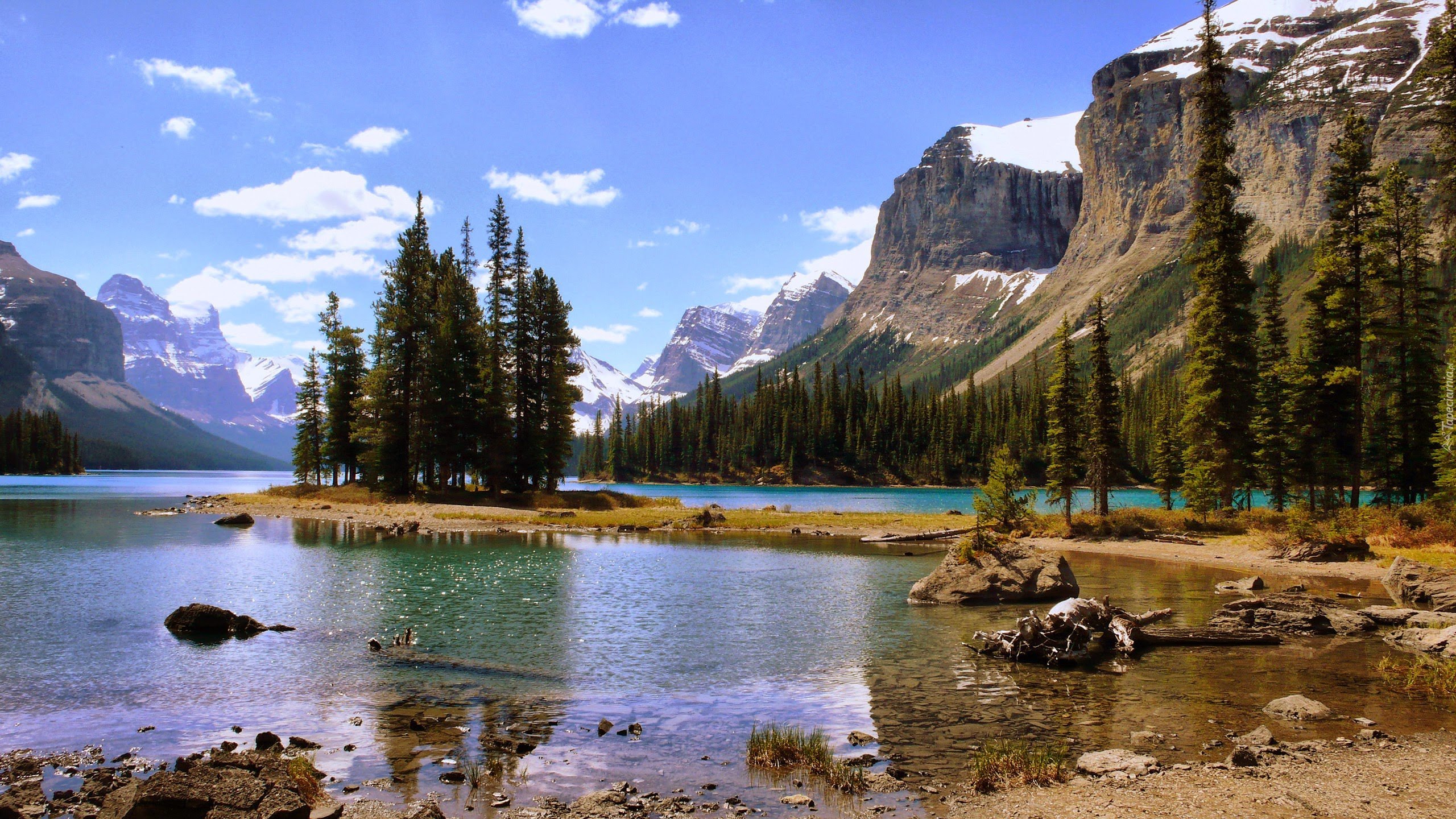 Edytor tapety: Góry, Jezioro, Drzewa, Las, Ośnieżone Szczyty, Kamienie