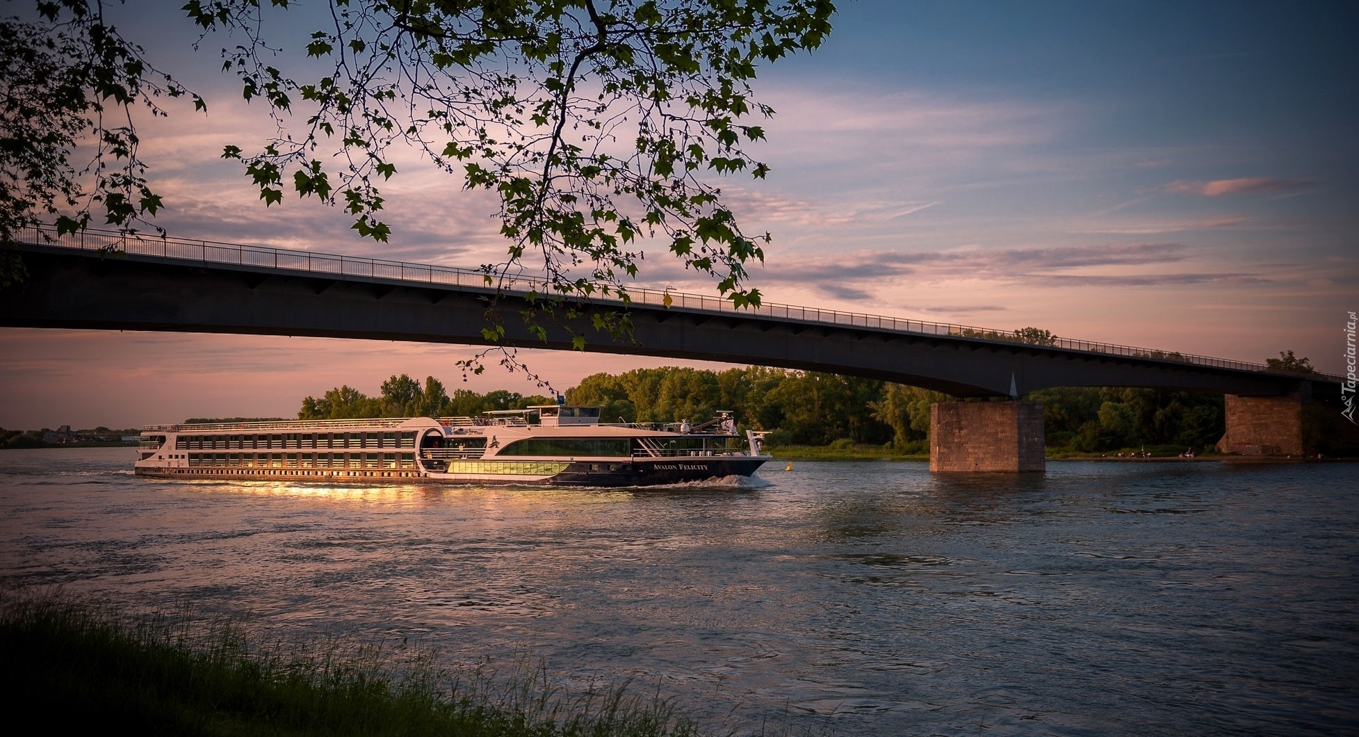 Edytor tapety: Rzeka, Statek, Most, Wschód, Słońca, Gałęzie, Drzewa