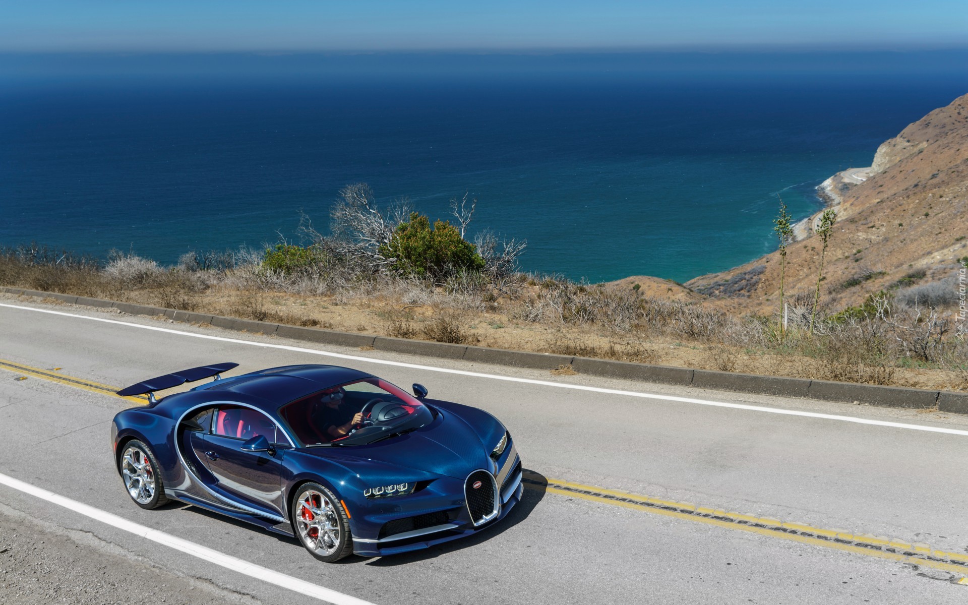 Edytor tapety: Samochód, Bugatti, Chiron, Droga, Brzeg, Morze, Roślinność