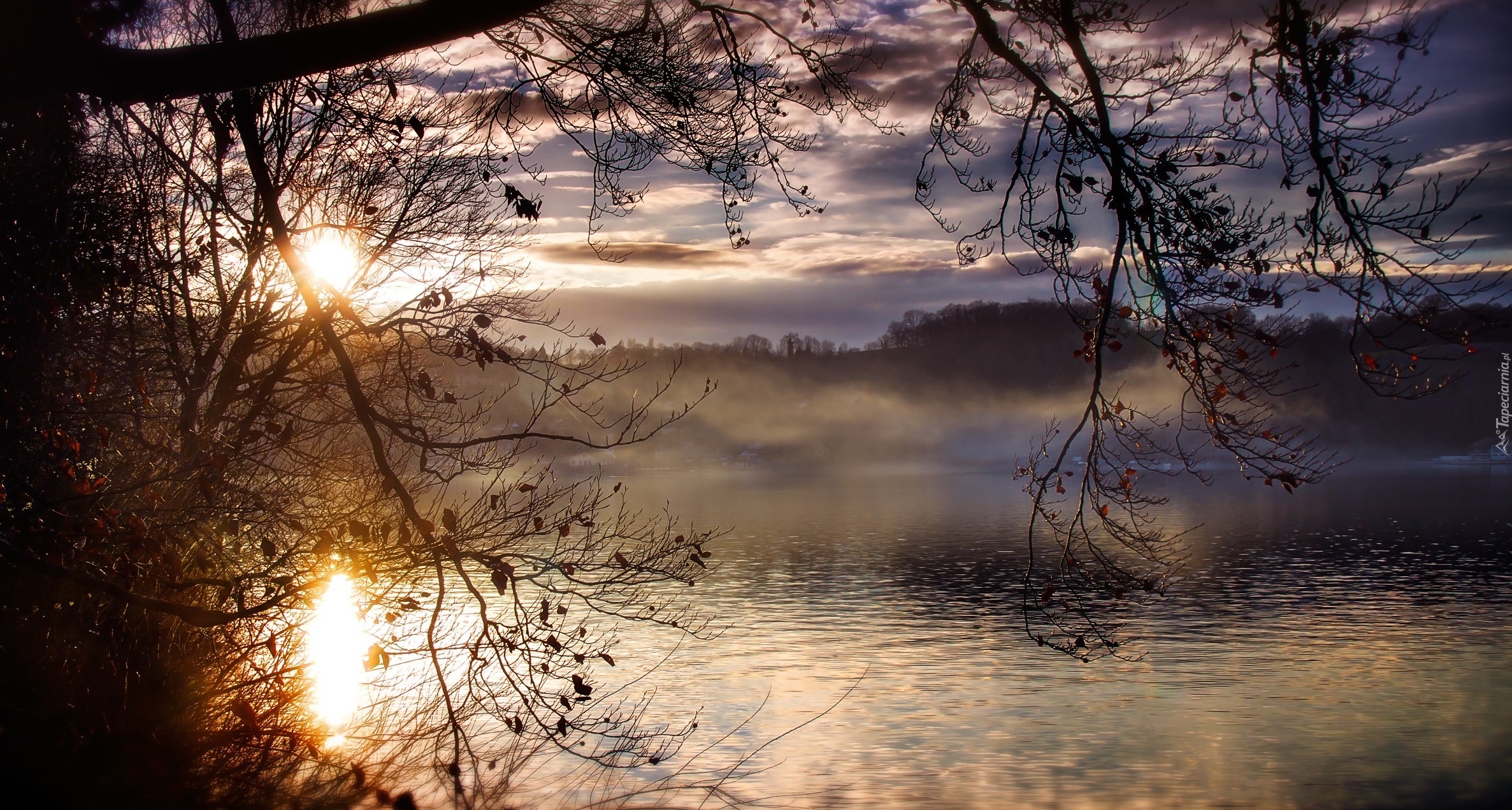 Edytor tapety: Jezioro, Mgła, Wschód słońca, Drzewa, Chmury