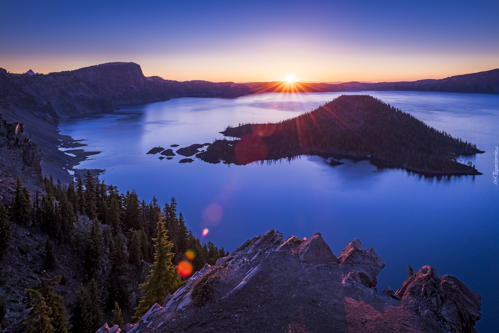 Edytor tapety: Jezioro, Promienie Słońca, Skały, Wyspa