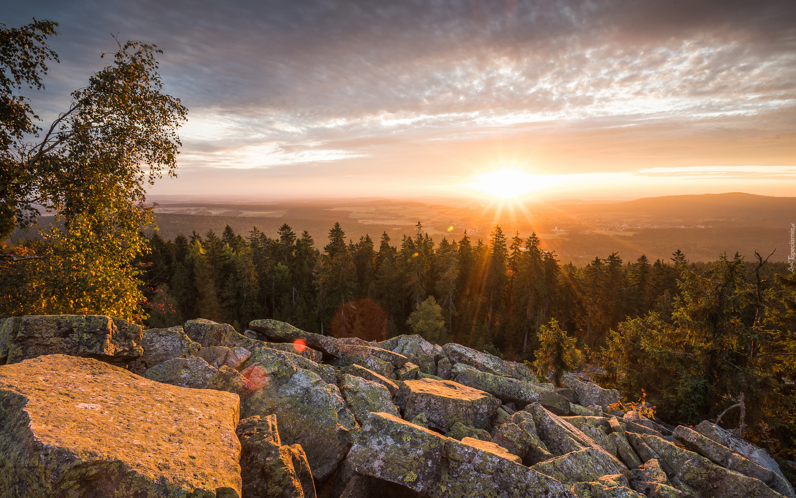 Edytor tapety: Las, Wschód słońca, Kamienie, Drzewa