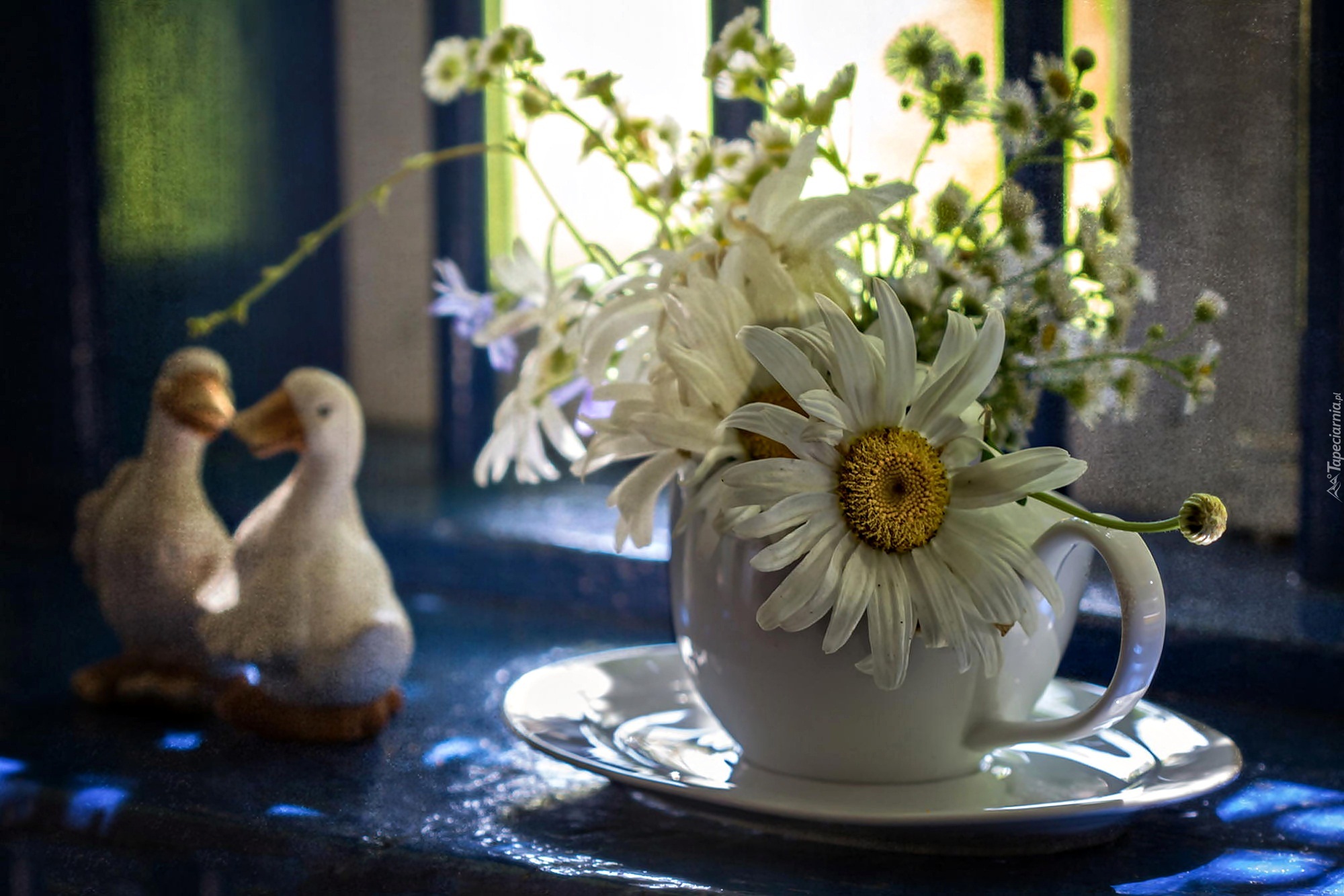 Edytor tapety: Bukiet, Kwiaty, Rumianki, Filiżanka, Talerzyk, Figurki, Kaczki