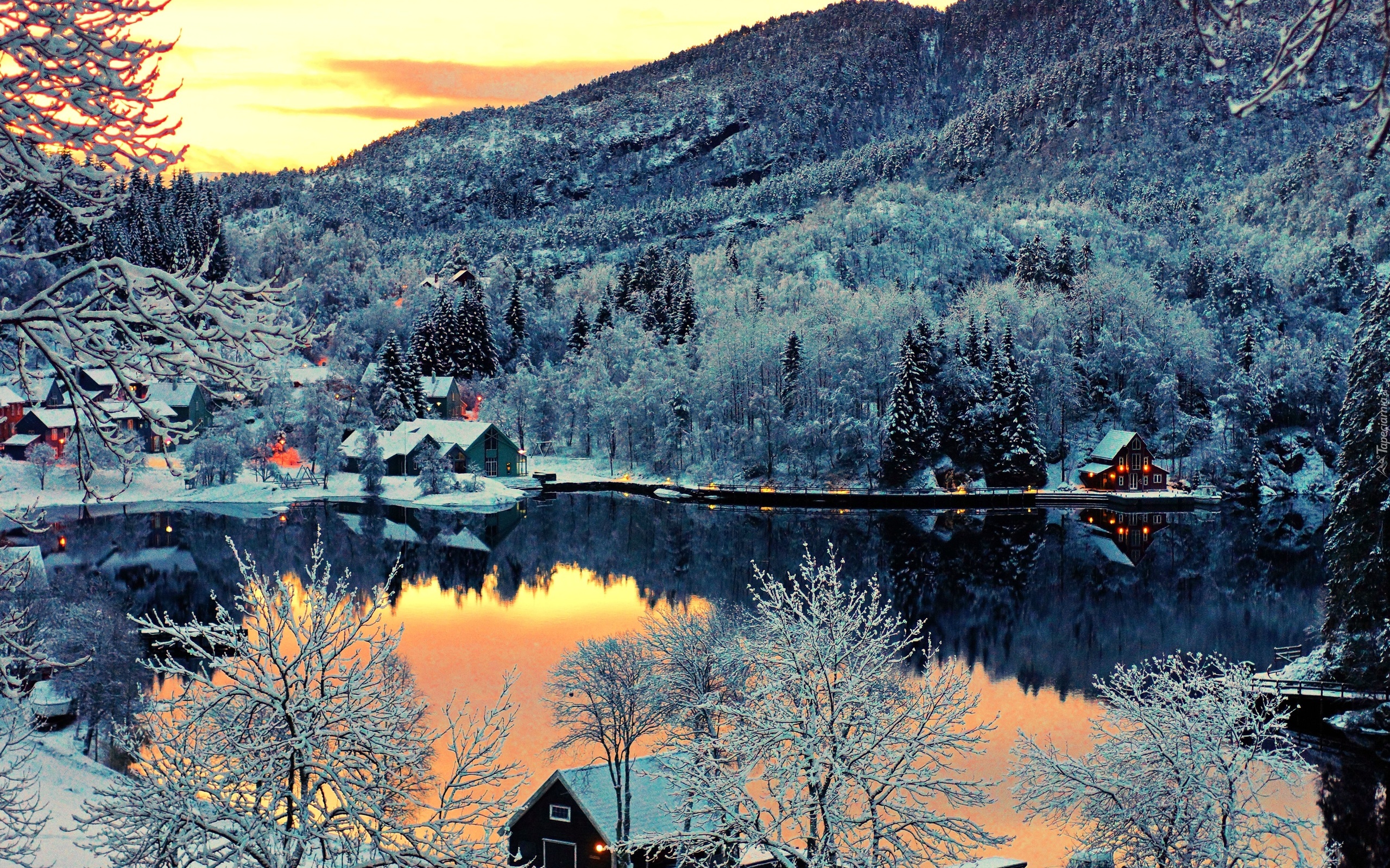 Edytor tapety: Góry, Jezioro, Zima, Las, Domy, Zachód słońca