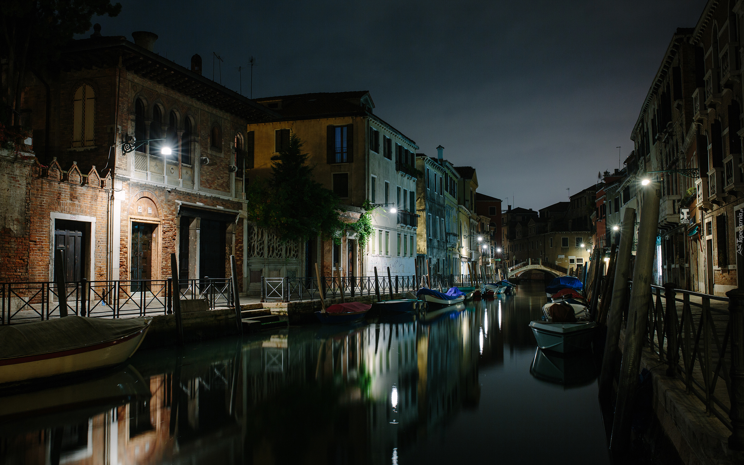 Edytor tapety: Miasto, Domy, Kanał, Łodzie, Noc, Światła