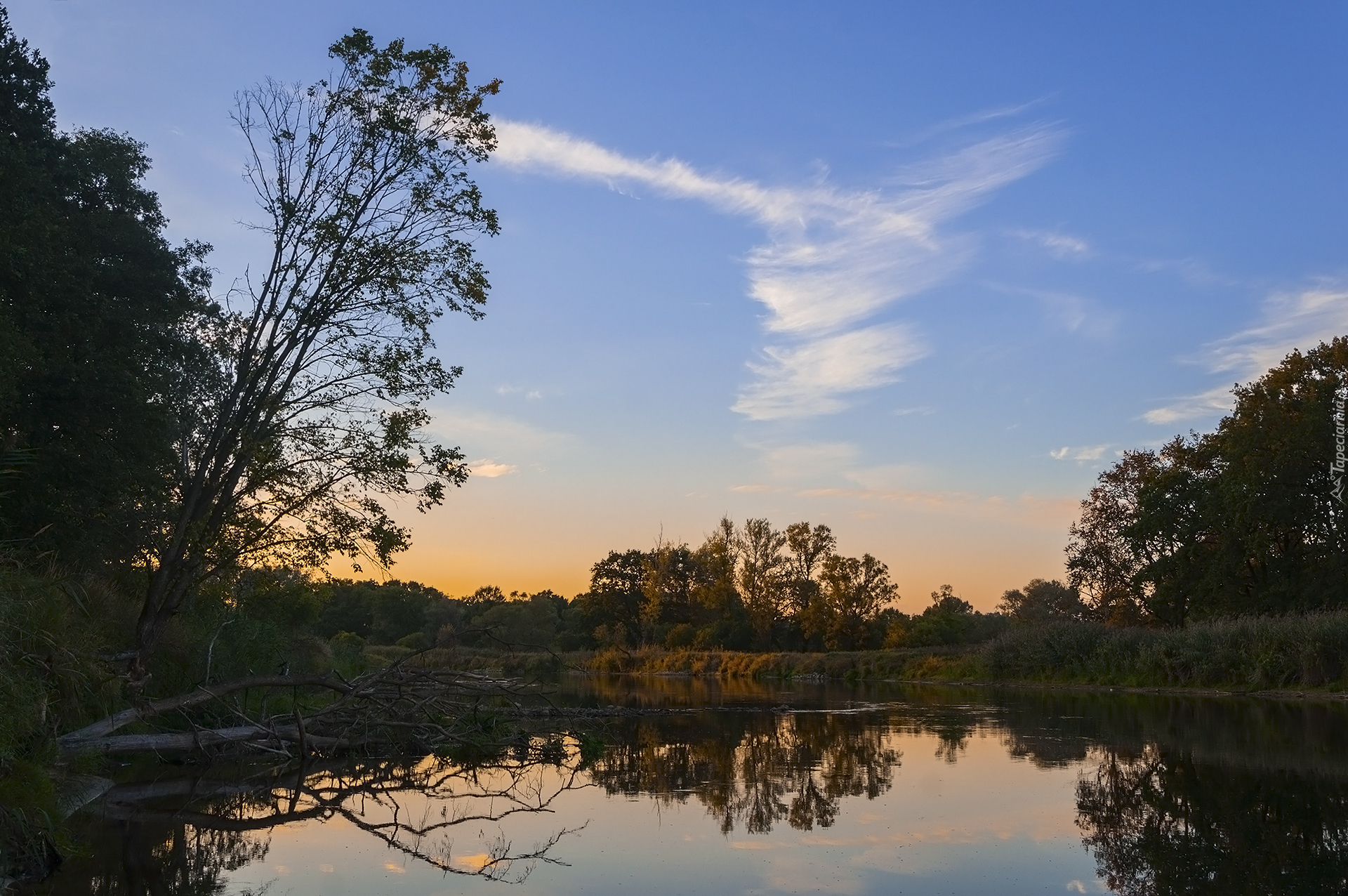 Edytor tapety: Rzeka, Warta, Drzewa, Zachód słońca, Niebo, Chmura
