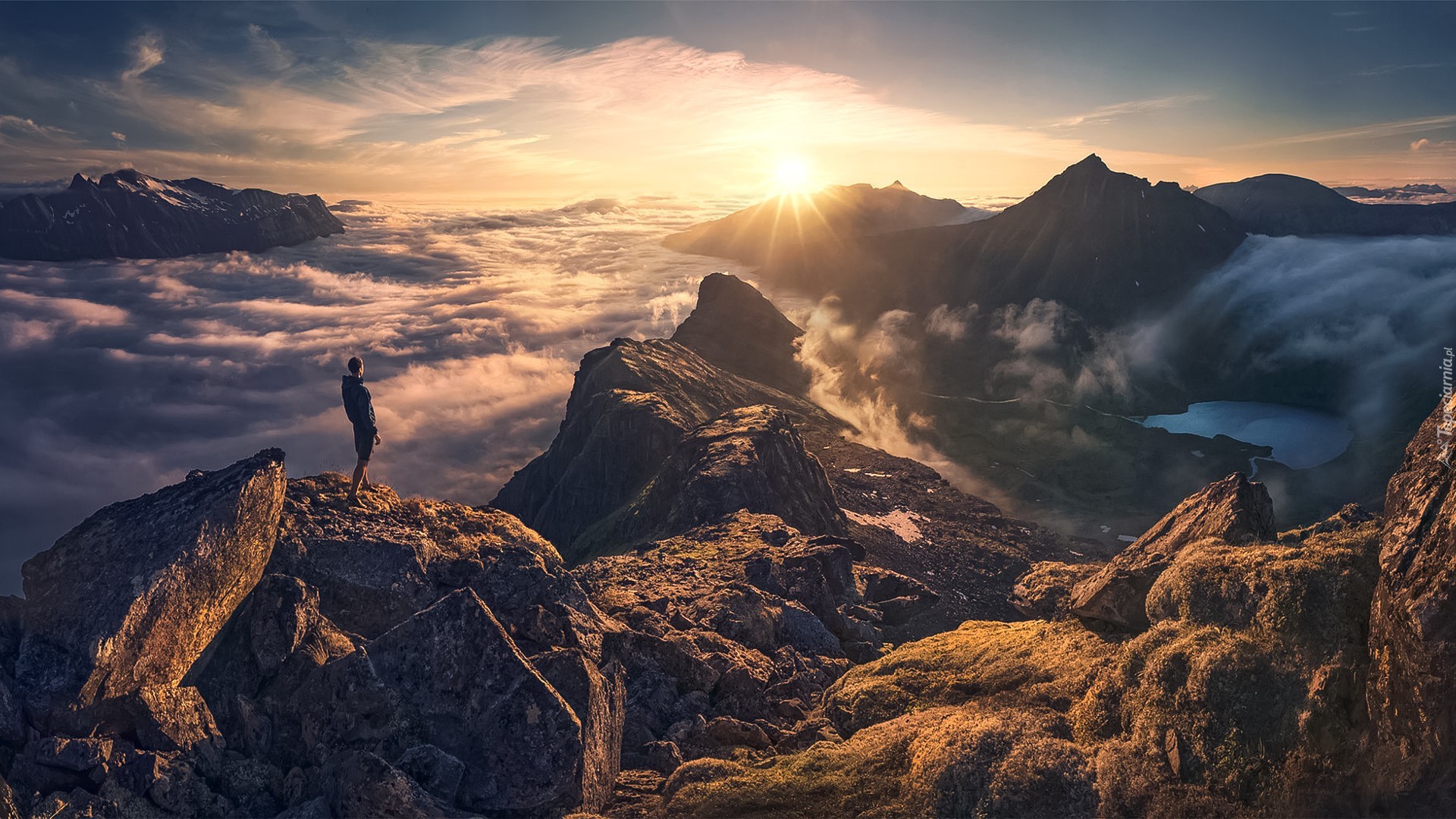 Edytor tapety: Góry, Mgła, Promienie, Słońca, Mężczyzna