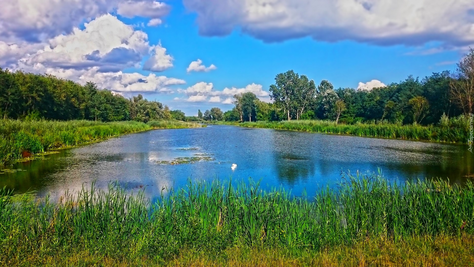 Edytor tapety: Jezioro, Staw, Drzewa, Trawa, lato