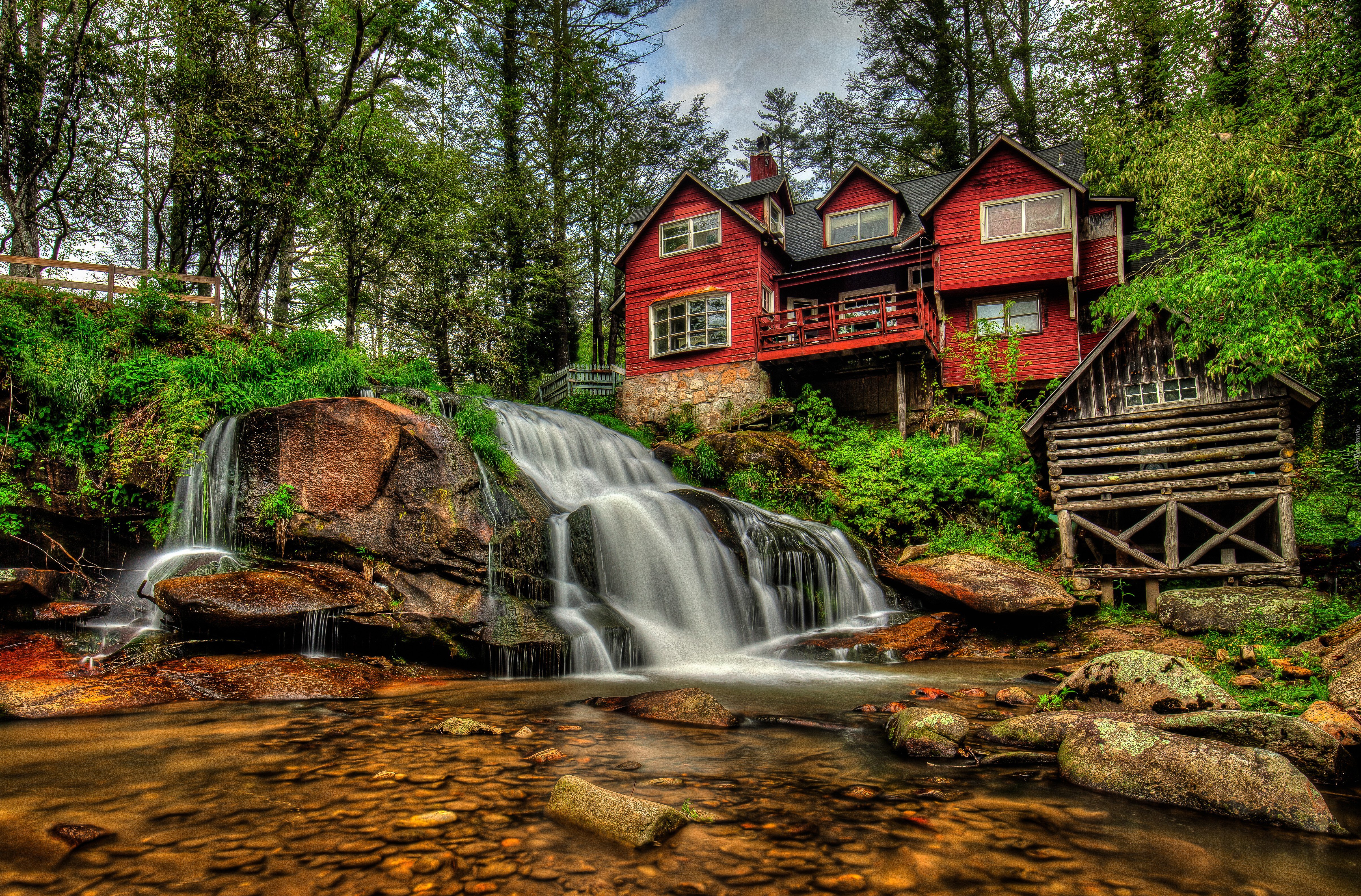 Edytor tapety: Rzeka, Wodospad, Dom, Drzewa, Kamienie