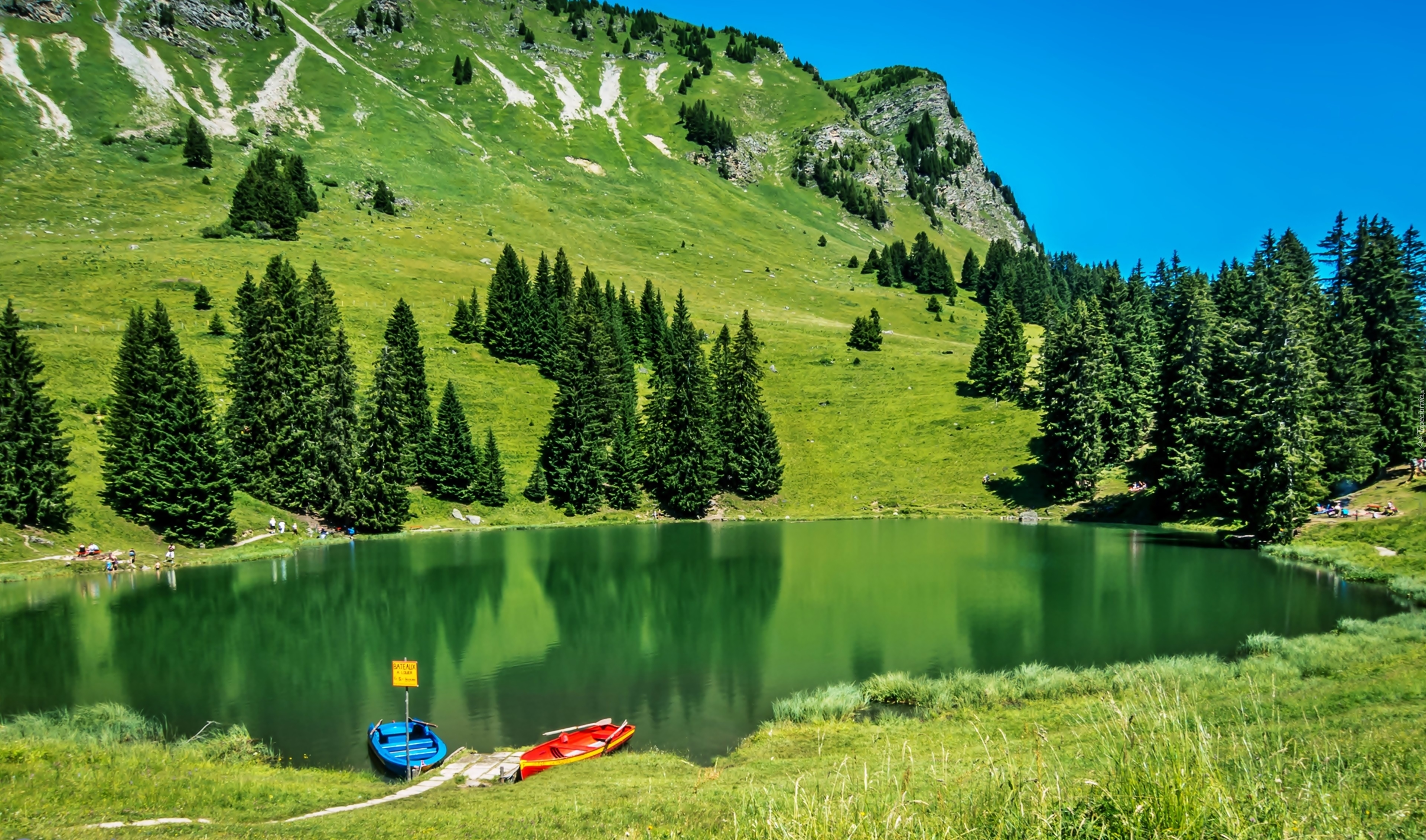 Edytor tapety: Jezioro, Góry, Łodzie, Drzewa