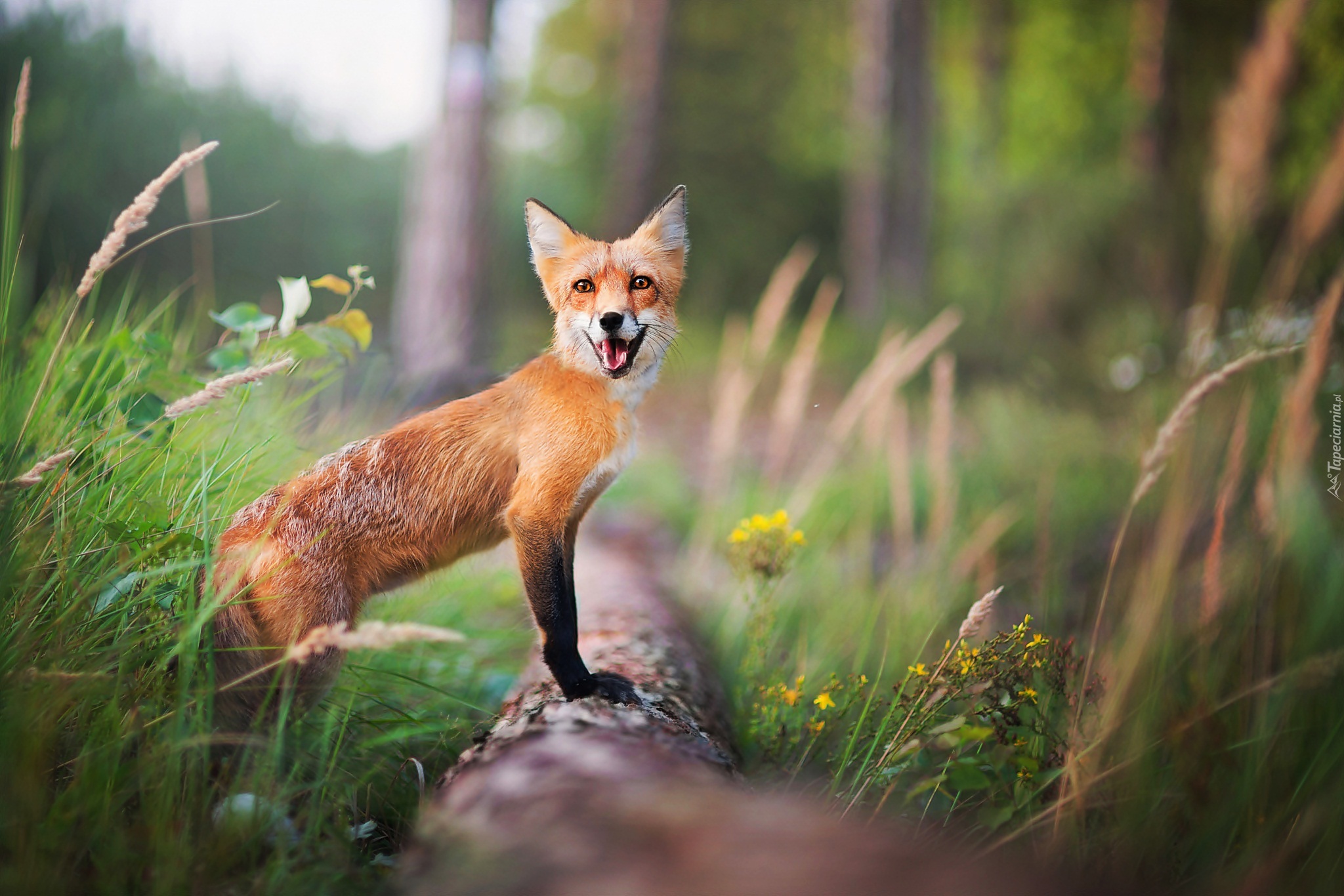 Edytor tapety: Lis, Drzewo, Kwiaty, Trawa