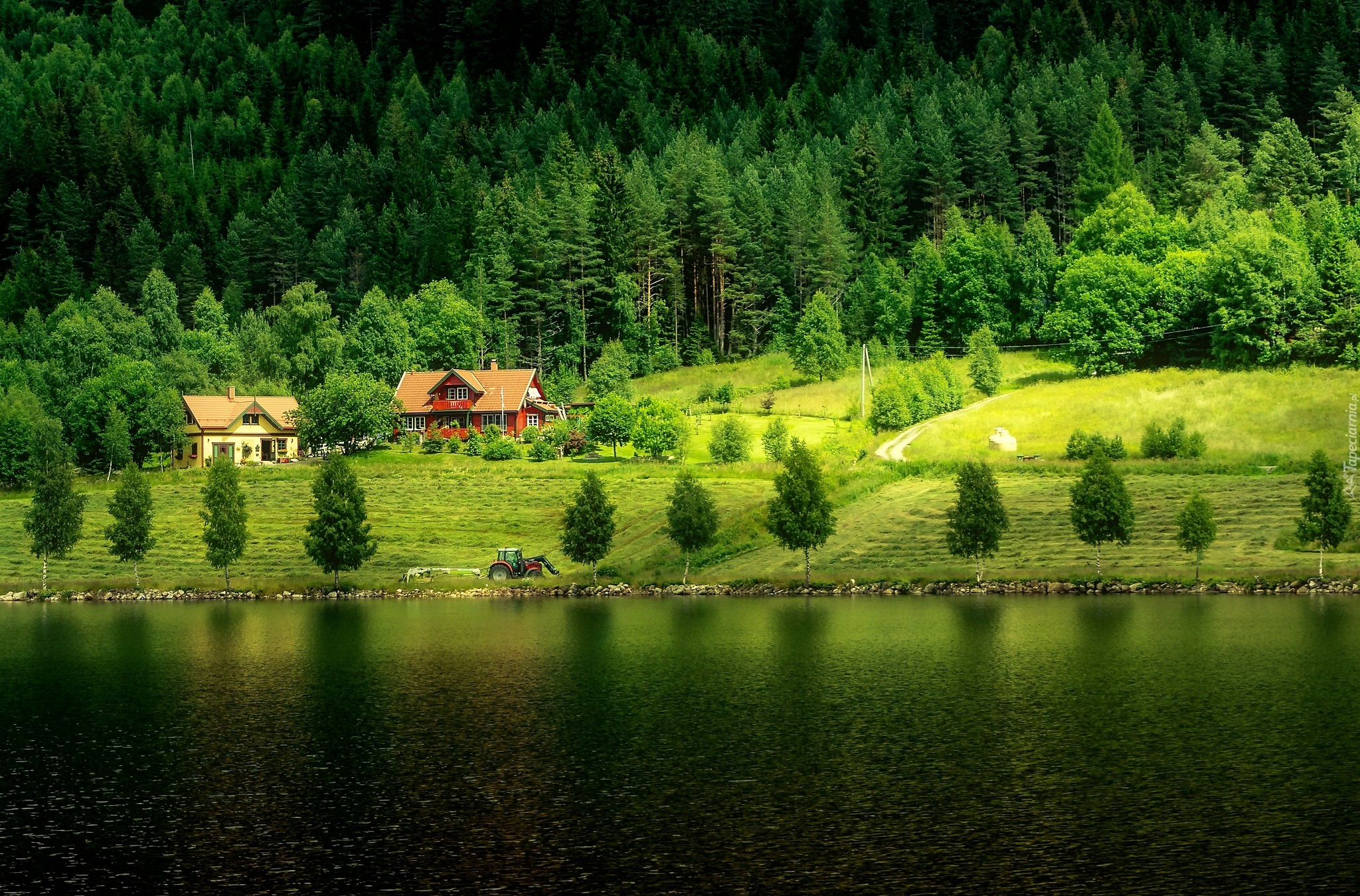 Edytor tapety: Lato, Rzeka, Domy, Pola, Las, Drzewa