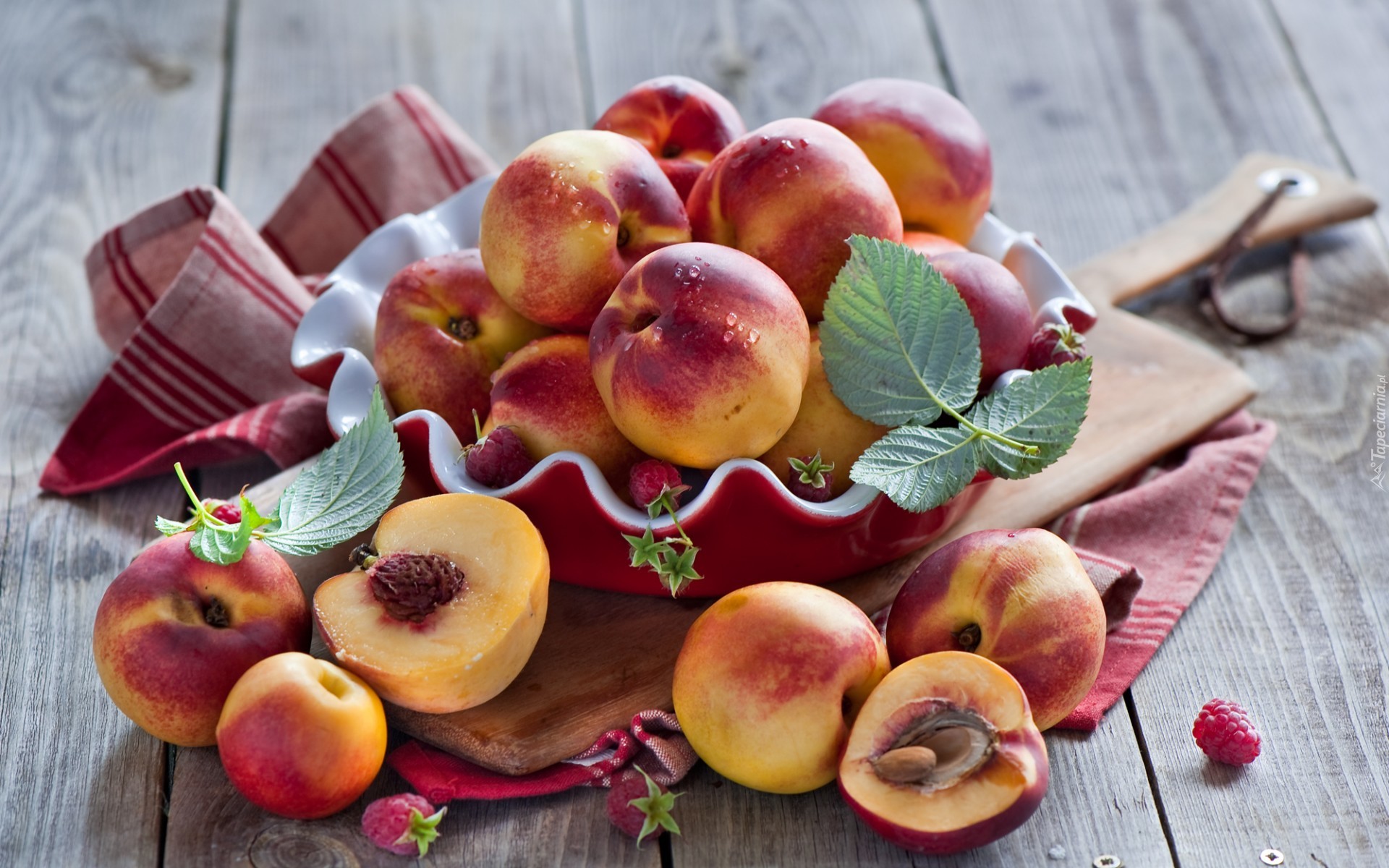 Edytor tapety: Kompozycja, Półmisek, Owoce, Nektarynki, Maliny, Listki