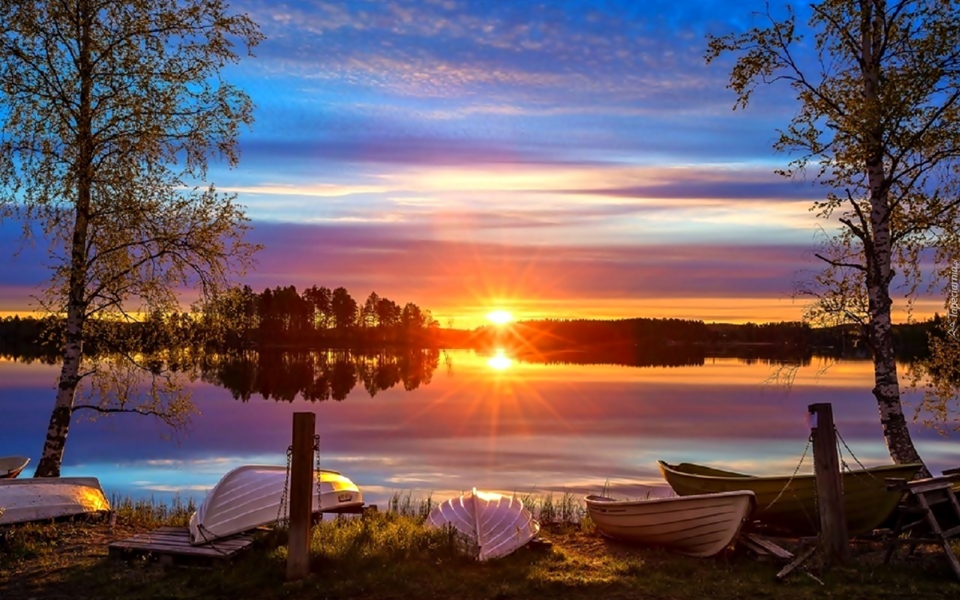 Edytor tapety: Jezioro, Łódki, Brzozy, Lasy, Wschód, Słońca, Promienie