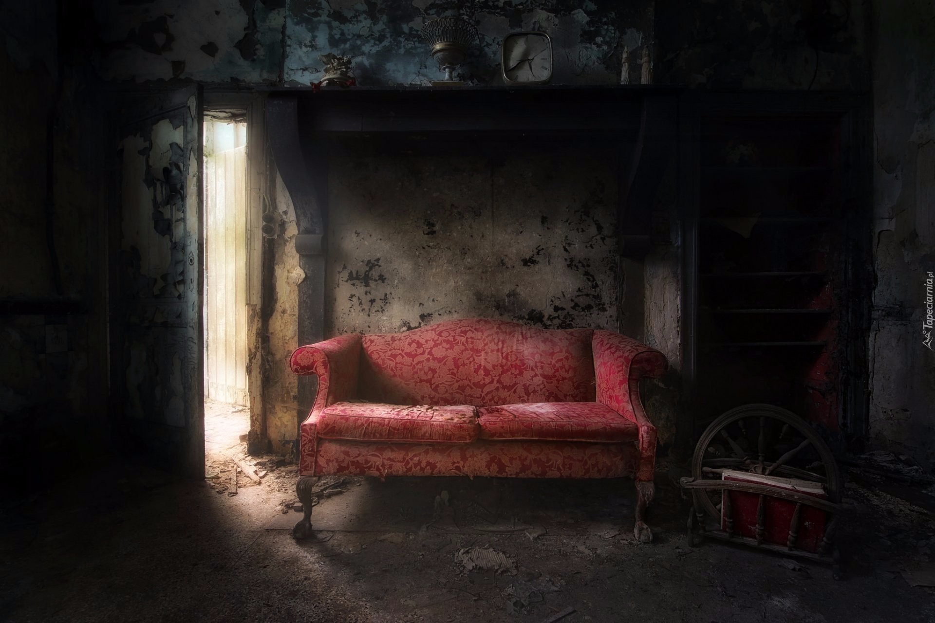 Edytor tapety: Zaniedbane, Pomieszczenie, Czerwona, Sofa